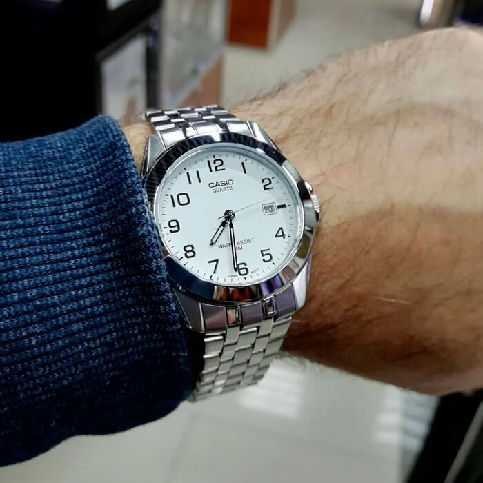 Практичные, стильные и универсальные наручные часы грамотно впишутся в любой модный образ. Ударопрочный корпусУдаропрочный корпусМеханизм заключён в корпус, выполненный из современных материалов, устойчивых к ударам, механическим повреждениям и падению с высоты: инновационный пластик, карбон, нержавеющая сталь, титан. выдержит любые негативные воздействия со стороны. На циферблате традиционной формы расположены аккуратные временные отметки в виде арабских цифр. Есть небольшое окошечко с датой. Гармоничный браслет из нержавеющей стали будет прочно сидеть на запястье. Люминесцентная подсветкаЛюминесцентное покрытиеПозволяет считывать показания времени в темноте. Производители наносят на стрелки, часовые индексы, безель или поверхность циферблата светонакопительный состав, дающий холодное свечение. обеспечит полноценную видимость показателей даже в темное время суток. Кварцевый тип механизма. Водонепроницаемость составляет 50 WR.