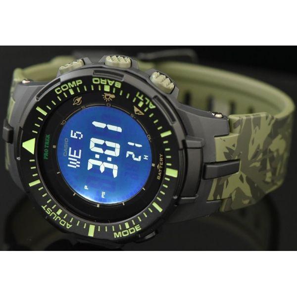 Часы, созданные для любителей активного отдыха. Противоударные мужские часы, выполненные в стиле миллитари. Кварцевые часы круглой формы с темно-зеленым цветом фона. Пластиковый корпус с минеральным стеклом удерживается пластиковым браслетом. Часы Casio PRG-300CM-3E оснащены секундомером, таймером обратного отсчета, барометром, высотомером, компасом. Источником энергии является солнечная батарея.