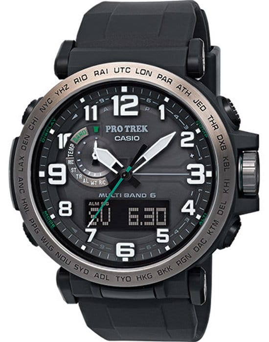 Полимерный ударопрочный корпусУдаропрочный корпусМеханизм заключён в корпус, выполненный из современных материалов, устойчивых к ударам, механическим повреждениям и падению с высоты: инновационный пластик, карбон, нержавеющая сталь, титан. защищает от ударов и повреждений, безельБезельВнешний ободок, закрепляющий стекло. В спортивных часах так называется поворотное кольцо с делениями на циферблате, выполняет роль таймера – замеряет отрезки времени на шкале. Неподвижный безель – элемент декора. Однонаправленно вращающийся безель на дайверских часах позволяет фиксировать моменты погружения и выныривания на поверхность. выполнен из нержавеющей стали 316L. Модель имеет расширенный список функциональных возможностей, способных быстро разрешить ту или иную ситуацию. Это барометр, термометр -10°C /+60°C, высотомер с памятью данных, мировое времяМировое время Полезное часовое усложнение, отображающее время в основных городах и известных областях по всему миру, оно связано с часовыми поясами, удобно для путешественников и бизнесменов. – 29 городов, компас, таймер, секундомер, будильник, хронографХронографФункция позволяет измерять отрезки времени с особой точностью: часы, минуты, секунды. Верным признаком хронографа является наличие на циферблате 3 дополнительных окошек-счётчиков.. Осуществляется питание от источников света , индикатор уровня заряда батарейки покажет, когда часы нужно ставить на подзарядку. Японский кварцевый механизм. Минеральное стекло. Циферблат со светодиодной подсветкойСветодиодная подсветкаСветодиодная или LED-подсветка обеспечивает появление яркого холодного свечения за счёт LED-элементов - маленьких лампочек. Они потребляют минимальное количество энергии, чаще всего можно встретить 1 светодиод, в нижней части циферблата.. Люминесцентное покрытие NeobriteПодсветка NeobriteИспользование светонакопительных составов на основе сульфида цинка или алюмината стронция, яркий свет можно наблюдать на протяжении 6-10 часов после «зарядки» часов около источника света. для стрелок. Степень водостойкости WR 100. Корректировка времени по радиосигналу, UTCUTCВсемирное кординационное время, не имеющее привязки к географическому положению Гринвича, основывается на атомном отсчёте времени. Регулировка времени осуществляется более точно, чем устаревшее GMT.