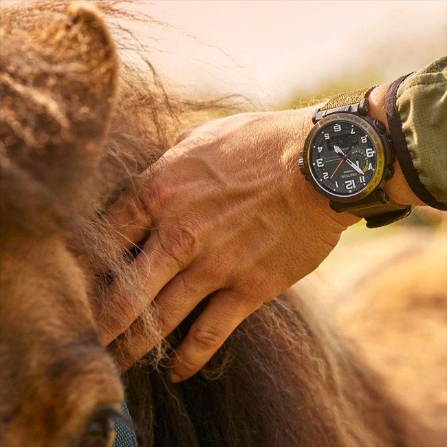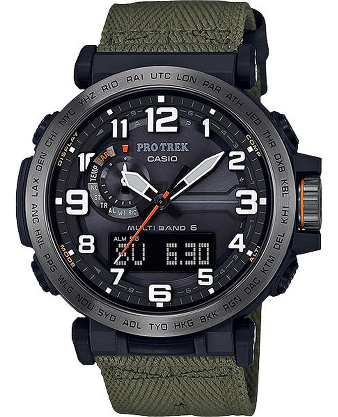 Полимерный ударопрочный корпусУдаропрочный корпусМеханизм заключён в корпус, выполненный из современных материалов, устойчивых к ударам, механическим повреждениям и падению с высоты: инновационный пластик, карбон, нержавеющая сталь, титан. защищает от ударов и повреждений, безельБезельВнешний ободок, закрепляющий стекло. В спортивных часах так называется поворотное кольцо с делениями на циферблате, выполняет роль таймера – замеряет отрезки времени на шкале. Неподвижный безель – элемент декора. Однонаправленно вращающийся безель на дайверских часах позволяет фиксировать моменты погружения и выныривания на поверхность. выполнен из нержавеющей стали 316L с IP-покрытиемIP-покрытиеМетод ионного напыления. Демонстрирует повышенную устойчивость к истиранию, окислению и химическим веществам. Под воздействием высокого давления и температуры около 1500°C молекулы металла надёжно соединяются с частицами корпуса часов.. Модель имеет расширенный список функциональных возможностей, способных быстро разрешить ту или иную ситуацию. Это барометр, термометр -10°C /+60°C, высотомер с памятью данных, мировое времяМировое время Полезное часовое усложнение, отображающее время в основных городах и известных областях по всему миру, оно связано с часовыми поясами, удобно для путешественников и бизнесменов. – 29 городов, компас, таймер, секундомер, будильник, хронографХронографФункция позволяет измерять отрезки времени с особой точностью: часы, минуты, секунды. Верным признаком хронографа является наличие на циферблате 3 дополнительных окошек-счётчиков.. Осуществляется питание от источников света , индикатор уровня заряда батарейки покажет, когда часы нужно ставить на подзарядку. Японский кварцевый механизм. Минеральное стекло. Циферблат со светодиодной подсветкойСветодиодная подсветкаСветодиодная или LED-подсветка обеспечивает появление яркого холодного свечения за счёт LED-элементов - маленьких лампочек. Они потребляют минимальное количество энергии, чаще всего можно встретить 1 светодиод, в нижней части циферблата.. Люминесцентное покрытие NeobriteПодсветка NeobriteИспользование светонакопительных составов на основе сульфида цинка или алюмината стронция, яркий свет можно наблюдать на протяжении 6-10 часов после «зарядки» часов около источника света. для стрелок. Степень водостойкости WR 100. Тканевый ремешок цвета хаки. Корректировка времени по радиосигналу, UTCUTCВсемирное кординационное время, не имеющее привязки к географическому положению Гринвича, основывается на атомном отсчёте времени. Регулировка времени осуществляется более точно, чем устаревшее GMT.