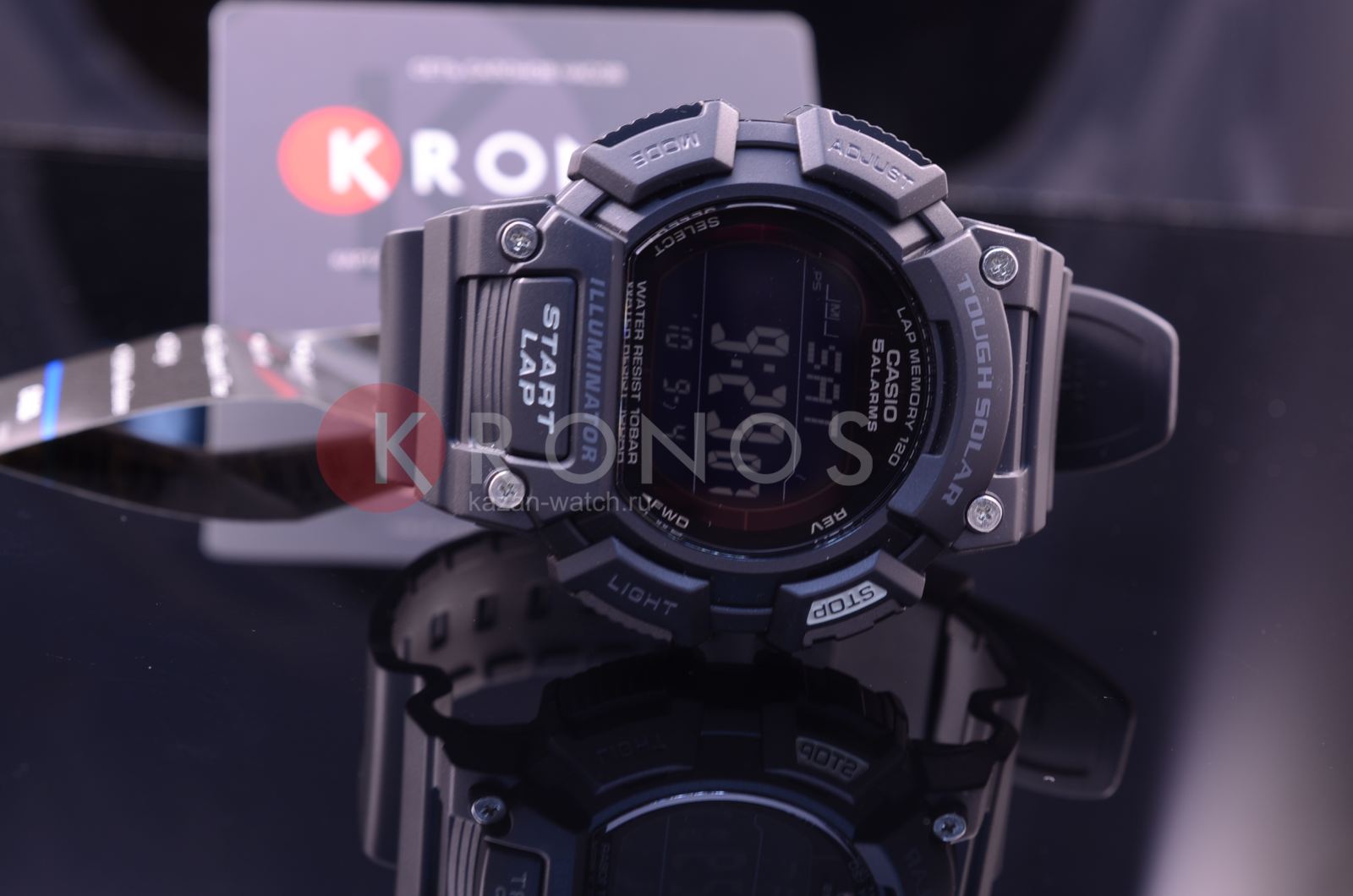 Спортивные японские часы на солнечной батареи.  Функция автоматического сохранения энергии. Время работы аккумулятора без подзарядки - 11 месяцев, при включенной функции сохранения энергии - 38 месяцев. Секундомер с точностью показаний 1/100с и временем измерения 100ч. Сплит-хронограф. Память на 120 этапов. Номер и лучшее время этапа. Два таймера обратного отсчета времени от 5с до 100мин с устанавливаемым количеством повторов от 1 до 10. Мировое время. 12-ти и 24-х часовой формат времени. Функция включения/отключения звука.