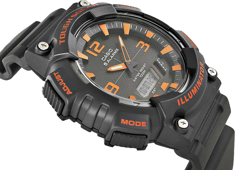 Многофункциональные и сдержанные часы в спортивном стиле станут идеальным выбором для современных мужчин. Analog-Digital Combination. LCD циферблат подсвечивается светодиодной подсветкойСветодиодная подсветкаСветодиодная или LED-подсветка обеспечивает появление яркого холодного свечения за счёт LED-элементов - маленьких лампочек. Они потребляют минимальное количество энергии, чаще всего можно встретить 1 светодиод, в нижней части циферблата.. Питание от солнечной энергии, индикатор заряда батареи. Функция автоматического сохранения энергии (отключает LCD дисплей). Время работы аккумулятора без подзарядки - 10 месяцев, при включенной функции сохранения энергии - 23 месяцев. CекундомерСекундомерСекундоме́р — прибор, способный измерять интервалы времени с точностью до долей секунды. с точностью показаний 1/100с и временем измерения 1ч. Два таймераТаймерОтсчитывает секунды в обратном направлении в заданном интервале времени. обратного отсчета времени от 5с до 100 мин с устанавливаемым количеством повторов от 1 до 10. Мировое времяМировое время Полезное часовое усложнение, отображающее время в основных городах и известных областях по всему миру, оно связано с часовыми поясами, удобно для путешественников и бизнесменов. . 12-ти и 24-х часовой формат времени. Шесть языков отображения дня недели: английский, португальский, испанский, французский, немецкий и итальянский. Функция включения/отключения звука. Класс водозащиты: 100 метров, позволит плавать, нырять и заниматься другими водными видами спорта. Пластиковый ремешок на стандартной застёжке.