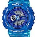 Противоударные японские женские часы Casio Baby-G BA-110JM-2A, кварцевый механизм с высокой точностью. Класс водозащиты: 100 метров, позволит плавать, нырять и заниматься другими водными видами спорта. Корпус часов изготовлен из пластика, прозрачного цвета.