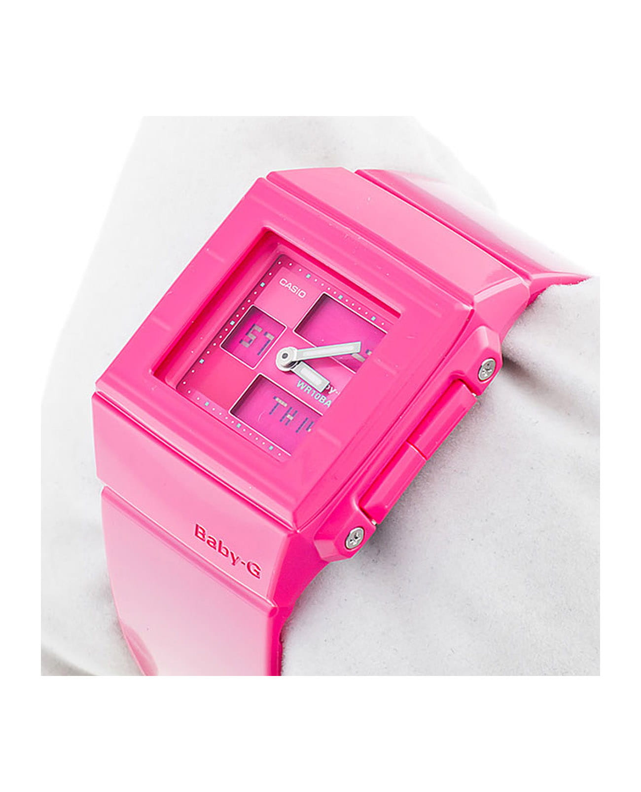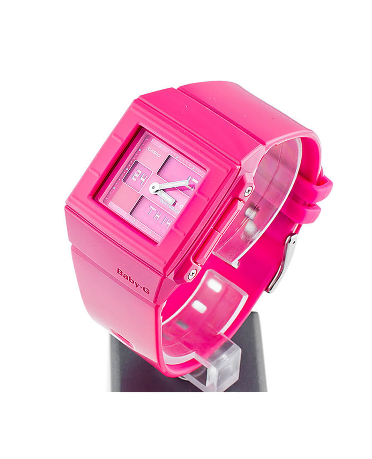 Японские женские часы-хронографХронографФункция позволяет измерять отрезки времени с особой точностью: часы, минуты, секунды. Верным признаком хронографа является наличие на циферблате 3 дополнительных окошек-счётчиков. Casio Baby-G BGA-200-4EDR из коллекции Baby-G. Минеральное стеклоМинеральное стеклоМинеральное стекло представляет собой искусственно выращенный минерал кварца. Такое стекло отличается особой устойчивостью к повреждениям и царапинам. Уступает по некоторым качествам сапфировому стеклу. устойчивое к появлению царапин, обладающее высокой прозрачностью. Корпус часов изготовлен из полимерного материала. Светодиодная подсветкаСветодиодная подсветкаСветодиодная или LED-подсветка обеспечивает появление яркого холодного свечения за счёт LED-элементов - маленьких лампочек. Они потребляют минимальное количество энергии, чаще всего можно встретить 1 светодиод, в нижней части циферблата. с функцией послесвечения. Ударопрочный корпусУдаропрочный корпусМеханизм заключён в корпус, выполненный из современных материалов, устойчивых к ударам, механическим повреждениям и падению с высоты: инновационный пластик, карбон, нержавеющая сталь, титан. защищает механизм от ударов и вибрации. Функция Мирового времениМировое время Полезное часовое усложнение, отображающее время в основных городах и известных областях по всему миру, оно связано с часовыми поясами, удобно для путешественников и бизнесменов. , автоматический переход на зимнее и летнее время, возможность включения/отключения данной функции. СекундомерСекундомерСекундоме́р — прибор, способный измерять интервалы времени с точностью до долей секунды. с точностью измерения 1/100 секунды и измерением до 23 часов 59 минут 59,99 cек. ТаймерТаймерОтсчитывает секунды в обратном направлении в заданном интервале времени. обратного отсчета (диапазон времени 24 часа), автоматический календарь, 12/24 отображение времени, будильникБудильникБуди́льник — часы, в заданный момент времени подающие звуковой, световой и/или в редких случаях другой сигнал.. Функция включения/отключения звука кнопок. Класс водозащиты: 100 метров, позволит плавать без погружения. Ремешок из полимерного материала на стандартной застежке.