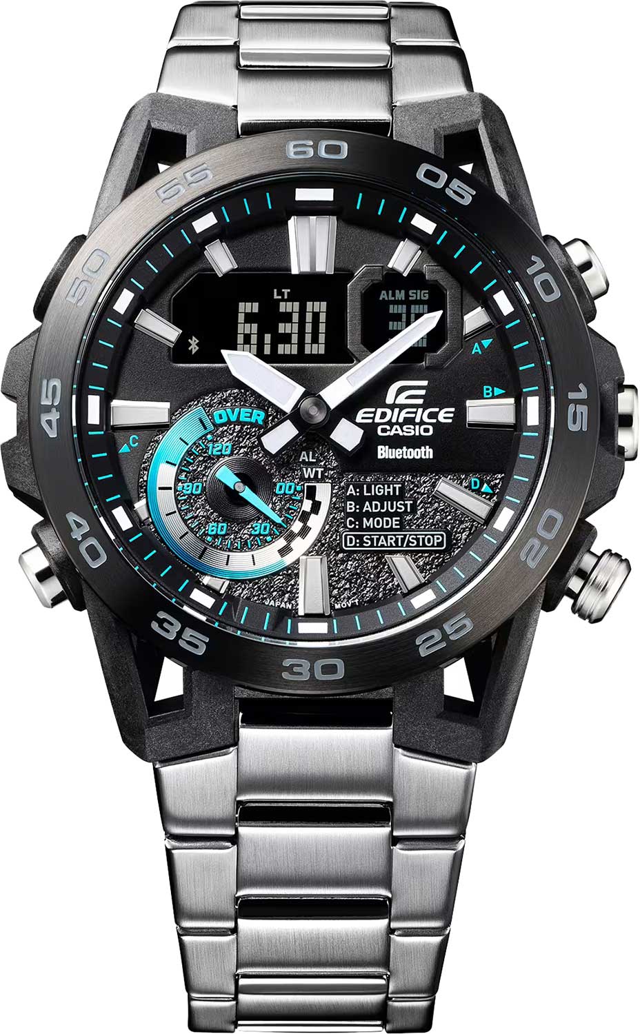 ). Автоматический переход на зимнее и летнее время, возможность включения/отключения данной функции. Переключение между домашним и мировым временем. Беспроводная технология BluetoothBluetoothСовременная технология, позволяющая синхронизировать часы с телефоном и переносить данные. Часы с Bluetooth расширяют возможности вашего смартфона и делают его использование ещё более удобным. со сверхнизким потреблением энергии для синхронизации со смартфоном. При подключении к смартфону часы корректируют текущее время, настраивают будильник, а также копируют настройки мирового времени (до 300 городов). Приложение EDIFICE Connected позволяет вести журнал показаний секундомера и прохождения этапов, вычислять разность между заданным временем и временем этапа. Отображение дней недели на шести языках. Смена отображения даты/месяца. Функции перемещения стрелок, поиска телефона и включения/отключения звука. Включение/выключение звукового сигнала по расписанию.