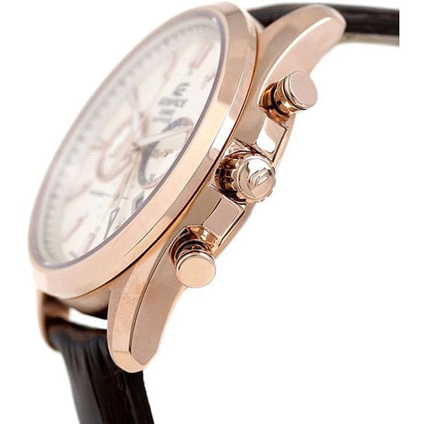 Мужские часы-хронографХронографФункция позволяет измерять отрезки времени с особой точностью: часы, минуты, секунды. Верным признаком хронографа является наличие на циферблате 3 дополнительных окошек-счётчиков. Casio Edifice EFB-504JGL-7A, кварцевый механизм с высокой точностью. Минеральное стеклоМинеральное стеклоМинеральное стекло представляет собой искусственно выращенный минерал кварца. Такое стекло отличается особой устойчивостью к повреждениям и царапинам. Уступает по некоторым качествам сапфировому стеклу. устойчивое к появлению царапин, обладающее высокой прозрачностью. СекундомерСекундомерСекундоме́р — прибор, способный измерять интервалы времени с точностью до долей секунды. с точностью показаний 1/10с и временем измерения 1ч. Корпус изготовлен из нержавеющей стали. БезельБезельВнешний ободок, закрепляющий стекло. В спортивных часах так называется поворотное кольцо с делениями на циферблате, выполняет роль таймера – замеряет отрезки времени на шкале. Неподвижный безель – элемент декора. Однонаправленно вращающийся безель на дайверских часах позволяет фиксировать моменты погружения и выныривания на поверхность. изготовлен из стали с IP-покрытиемIP-покрытиеМетод ионного напыления. Демонстрирует повышенную устойчивость к истиранию, окислению и химическим веществам. Под воздействием высокого давления и температуры около 1500°C молекулы металла надёжно соединяются с частицами корпуса часов.. Стрелки и метки с люминесцентным покрытиемЛюминесцентное покрытиеПозволяет считывать показания времени в темноте. Производители наносят на стрелки, часовые индексы, безель или поверхность циферблата светонакопительный состав, дающий холодное свечение.. Окошко даты находится между метками 4 и 5 часов. Класс водозащиты: 100 метров, позволит плавать, нырять и заниматься другими водными видами спорта. Заводная головка с защитой. Кожаный ремешок на стандартной застежке.