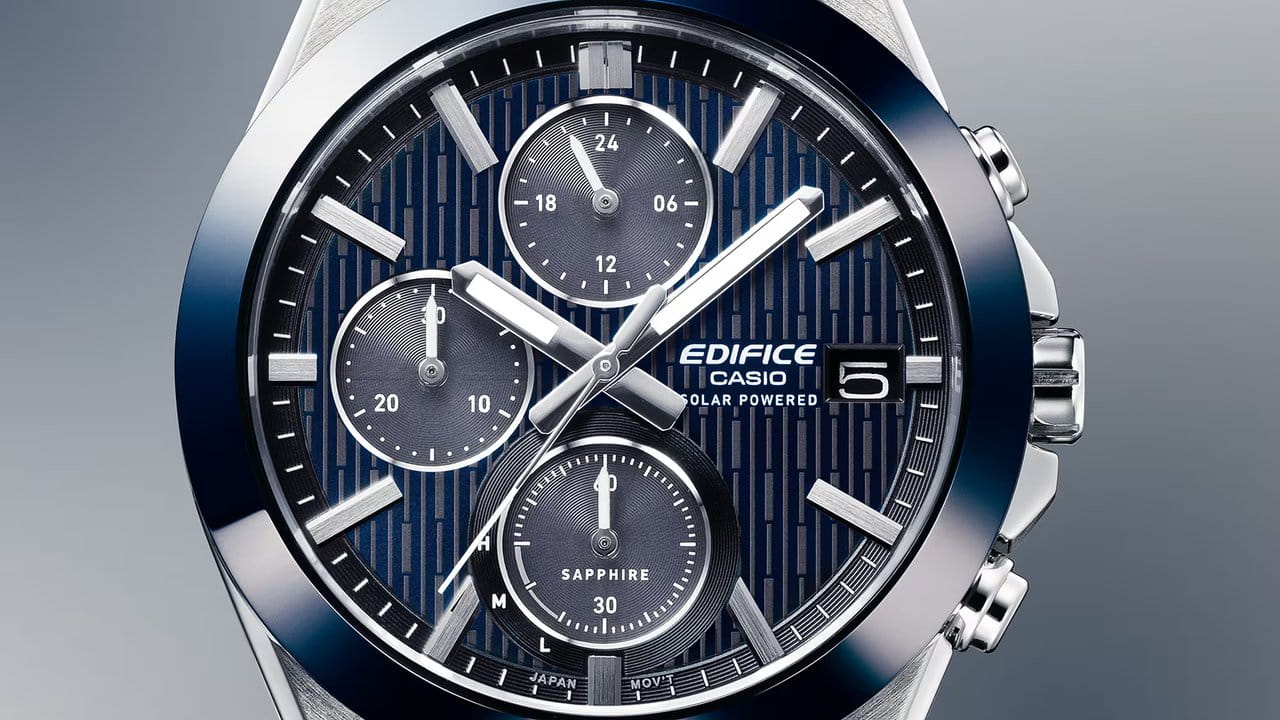Мужские кварцевые часы Casio из коллекции Edifice — это первая модель в серии с керамическим безелем, сочетающая изысканность и высокую прочность. Корпус размером 40,9×46,7 мм и толщиной 11,7 мм выполнен из нержавеющей стали 316L. БезельБезельВнешний ободок, закрепляющий стекло. В спортивных часах так называется поворотное кольцо с делениями на циферблате, выполняет роль таймера – замеряет отрезки времени на шкале. Неподвижный безель – элемент декора. Однонаправленно вращающийся безель на дайверских часах позволяет фиксировать моменты погружения и выныривания на поверхность. изготовлен из высокотехнологичной керамики, устойчивой к царапинам, что придаёт изделию премиальный вид и повышенную долговечность. Циферблат синего цвета оформлен штрихами и субциферблатами хронографа. Окошко даты расположено в положении 3 часов. Циферблат защищён сапфировым стекломСапфировое стеклоПрочный и надёжный материал из кристалла сапфира синтетического происхождения, характеризующийся особой твёрдостью и устойчивостью к царапинам и повреждениям. с антибликовым покрытиемАнтибликовое покрытиеСлой оксида металла в 0,13-0,3 микрон, благодаря которому стекло часов не бликует и не отражает свет. Антибликовое покрытие уменьшает отражение света в 10 раз, обеспечивая отличную читаемость показателей циферблата.. Механизм работает от солнечной энергии (Tough SolarTough SolarТехнология основана на подзарядке аккумулятора от источника солнечного света, специальная панель улавливает солнечные лучи и преобразует их в энергию для работы часов. Достаточно пары минут нахождения на солнце для функционирования часов в течении суток.) с индикацией заряда батареи и обеспечивает до 5 месяцев автономной работы без подзарядки. Часы оснащены функциями хронографаХронографФункция позволяет измерять отрезки времени с особой точностью: часы, минуты, секунды. Верным признаком хронографа является наличие на циферблате 3 дополнительных окошек-счётчиков. и секундомераСекундомерСекундоме́р — прибор, способный измерять интервалы времени с точностью до долей секунды., а также 12/24-часовым форматом времени. Часы оснащены литым стальным браслетом на тройной раскладной застёжкеРаскладная застёжкаТакой тип застёжки используется только на браслетах из металла. Она никогда не раскрывается полностью, происходит разделение на 2 и более частей. Раскладывающая застёжка снизит вероятность потери часов к минимуму. с быстрым открытием. Водонепроницаемость 100 м позволяет использовать часы для плавания и повседневного ношения. Идеальный выбор для тех, кто ценит технологии, стиль и надёжность.