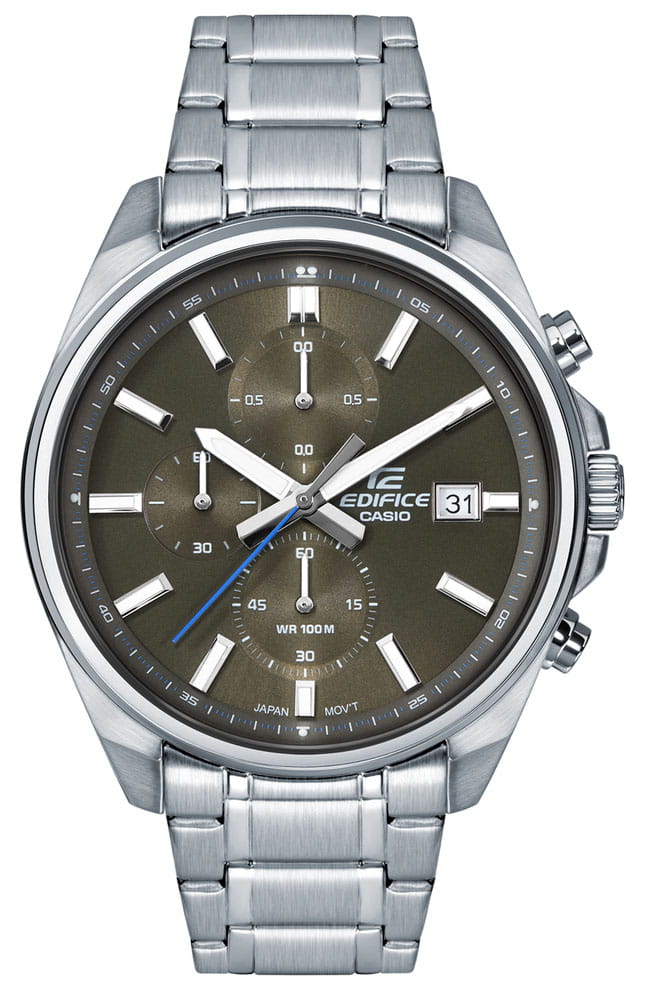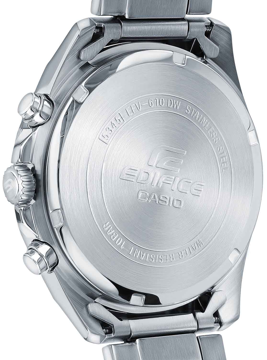 Японские мужские часы-хронографХронографФункция позволяет измерять отрезки времени с особой точностью: часы, минуты, секунды. Верным признаком хронографа является наличие на циферблате 3 дополнительных окошек-счётчиков. с секундомеромСекундомерСекундоме́р — прибор, способный измерять интервалы времени с точностью до долей секунды. Casio Edifice EFV-610D-5C, кварцевый механизм с высокой точностью. Класс водозащиты: 100 метров, позволит плавать, нырять и заниматься другими водными видами спорта. Корпус часов изготовлен из стали. Подсветка NeobriteПодсветка NeobriteИспользование светонакопительных составов на основе сульфида цинка или алюмината стронция, яркий свет можно наблюдать на протяжении 6-10 часов после «зарядки» часов около источника света. обеспечивает длительное послесвечение в темноте даже после кратковременного нахождения на свету. Часы-хронографХронографФункция позволяет измерять отрезки времени с особой точностью: часы, минуты, секунды. Верным признаком хронографа является наличие на циферблате 3 дополнительных окошек-счётчиков. с секундомеромСекундомерСекундоме́р — прибор, способный измерять интервалы времени с точностью до долей секунды. с точностью показаний 1/10с и временем измерения 1ч. Циферблат с метками в виде штрихов. Окошко даты находится в положении 3 часа. Задняя крышка с винтовым фиксатором. Батарея рассчитана на 3 года. Водонепроницаемость в соответствии с ISO 2281. Литой стальной браслет на раскладной застёжкеРаскладная застёжкаТакой тип застёжки используется только на браслетах из металла. Она никогда не раскрывается полностью, происходит разделение на 2 и более частей. Раскладывающая застёжка снизит вероятность потери часов к минимуму.. Предохранительная защелка на браслете препятствует случайному расстегиванию.