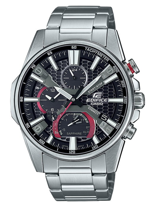 Карбоновый безель гармонируют с серым фоном. Часы выполнены в спортивном стиле, ссылаясь на дизайн эксклюзивных спорткаров и автомобильных деталей. Они основаны на технологии , оснащены расширенными функциональными возможностями: BluetoothBluetoothСовременная технология, позволяющая синхронизировать часы с телефоном и переносить данные. Часы с Bluetooth расширяют возможности вашего смартфона и делают его использование ещё более удобным. нового поколения с низким потреблением энергии, автоматический календарь, хронографХронографФункция позволяет измерять отрезки времени с особой точностью: часы, минуты, секунды. Верным признаком хронографа является наличие на циферблате 3 дополнительных окошек-счётчиков., секундомер, индикатор последнего круга дистанции Last Lap Indicator, мировое время. Модель комплектуется надёжным браслетом из нержавеющей стали. Заводная головка с защитой. Ударопрочный корпусУдаропрочный корпусМеханизм заключён в корпус, выполненный из современных материалов, устойчивых к ударам, механическим повреждениям и падению с высоты: инновационный пластик, карбон, нержавеющая сталь, титан.. Сапфировое стекло с антибликовым покрытием. Водонепроницаемость WR 100. Подсветка NeobriteПодсветка NeobriteИспользование светонакопительных составов на основе сульфида цинка или алюмината стронция, яркий свет можно наблюдать на протяжении 6-10 часов после «зарядки» часов около источника света.. Габариты: 50 x 45,2 x 9,6 мм.