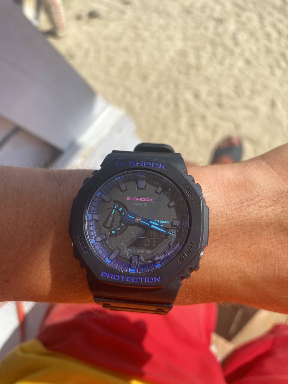 Японские мужские часы-хронографХронографФункция позволяет измерять отрезки времени с особой точностью: часы, минуты, секунды. Верным признаком хронографа является наличие на циферблате 3 дополнительных окошек-счётчиков. Casio G-Shock GA-2100VB-1A из коллекции G-Shock. Противоударный пластиковый корпус с карбоновыми волокнами более прочный и, в то же время, более легкий.  Минеральное стеклоМинеральное стеклоМинеральное стекло представляет собой искусственно выращенный минерал кварца. Такое стекло отличается особой устойчивостью к повреждениям и царапинам. Уступает по некоторым качествам сапфировому стеклу. устойчивое к появлению царапин, обладающее высокой прозрачностью. Ударопрочный корпусУдаропрочный корпусМеханизм заключён в корпус, выполненный из современных материалов, устойчивых к ударам, механическим повреждениям и падению с высоты: инновационный пластик, карбон, нержавеющая сталь, титан. защищает механизм от ударов и вибрации. Светодиодная подсветкаСветодиодная подсветкаСветодиодная или LED-подсветка обеспечивает появление яркого холодного свечения за счёт LED-элементов - маленьких лампочек. Они потребляют минимальное количество энергии, чаще всего можно встретить 1 светодиод, в нижней части циферблата. освещает весь циферблат. Мировое времяМировое время Полезное часовое усложнение, отображающее время в основных городах и известных областях по всему миру, оно связано с часовыми поясами, удобно для путешественников и бизнесменов. – 48 городов (29 часовых поясов). СекундомерСекундомерСекундоме́р — прибор, способный измерять интервалы времени с точностью до долей секунды. с точностью измерения 1/100 секунды и измерением до 23 часов 59 минут 59,99 cек. ТаймерТаймерОтсчитывает секунды в обратном направлении в заданном интервале времени. обратного отсчета (диапазон времени 24 часа), автоматический календарь, 12/24 отображение времени. 5 будильниковБудильникБуди́льник — часы, в заданный момент времени подающие звуковой, световой и/или в редких случаях другой сигнал., один с функцией Snooze, ежечасный сигнал.  Класс водозащиты: 200 метров, позволит плавать, нырять и заниматься другими водными видами спорта. Ремешок из полимерного материала на стандартной застежке.