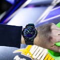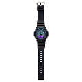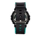 Основным цветом стал чёрный, на тёмном фоне отлично смотрятся фиолетовые и бирюзовые детали. При создании модели дизайнеры вдохновлялись атмосферой ночных клубов, где часто проводят время молодые люди. Аксессуар имеет уменьшенный противоударный корпусУдаропрочный корпусМеханизм заключён в корпус, выполненный из современных материалов, устойчивых к ударам, механическим повреждениям и падению с высоты: инновационный пластик, карбон, нержавеющая сталь, титан., если сравнивать с представителями серии GA-700, устойчивый к ударам и вибрации. Он надёжно защищает японский кварцевый механизм с точностью хода -/+ 15 секунд в месяц. Батарейка характеризуется 3-летним сроком службы. Прочное минеральное стекло. Автоматическая светодиодная подсветкаСветодиодная подсветкаСветодиодная или LED-подсветка обеспечивает появление яркого холодного свечения за счёт LED-элементов - маленьких лампочек. Они потребляют минимальное количество энергии, чаще всего можно встретить 1 светодиод, в нижней части циферблата., стрелки с люминесцентным покрытиемЛюминесцентное покрытиеПозволяет считывать показания времени в темноте. Производители наносят на стрелки, часовые индексы, безель или поверхность циферблата светонакопительный состав, дающий холодное свечение.. Минеральное стекло. Водозащита до 200 метров. Браслет из полимерного материала. Функция перемещения стрелок для лёгкого доступа к показаниям с цифровых мини-дисплеев. ХронографХронографФункция позволяет измерять отрезки времени с особой точностью: часы, минуты, секунды. Верным признаком хронографа является наличие на циферблате 3 дополнительных окошек-счётчиков., таймер обратного отсчёта, мировое времяМировое время Полезное часовое усложнение, отображающее время в основных городах и известных областях по всему миру, оно связано с часовыми поясами, удобно для путешественников и бизнесменов. , будильник, UTCUTCВсемирное кординационное время, не имеющее привязки к географическому положению Гринвича, основывается на атомном отсчёте времени. Регулировка времени осуществляется более точно, чем устаревшее GMT.