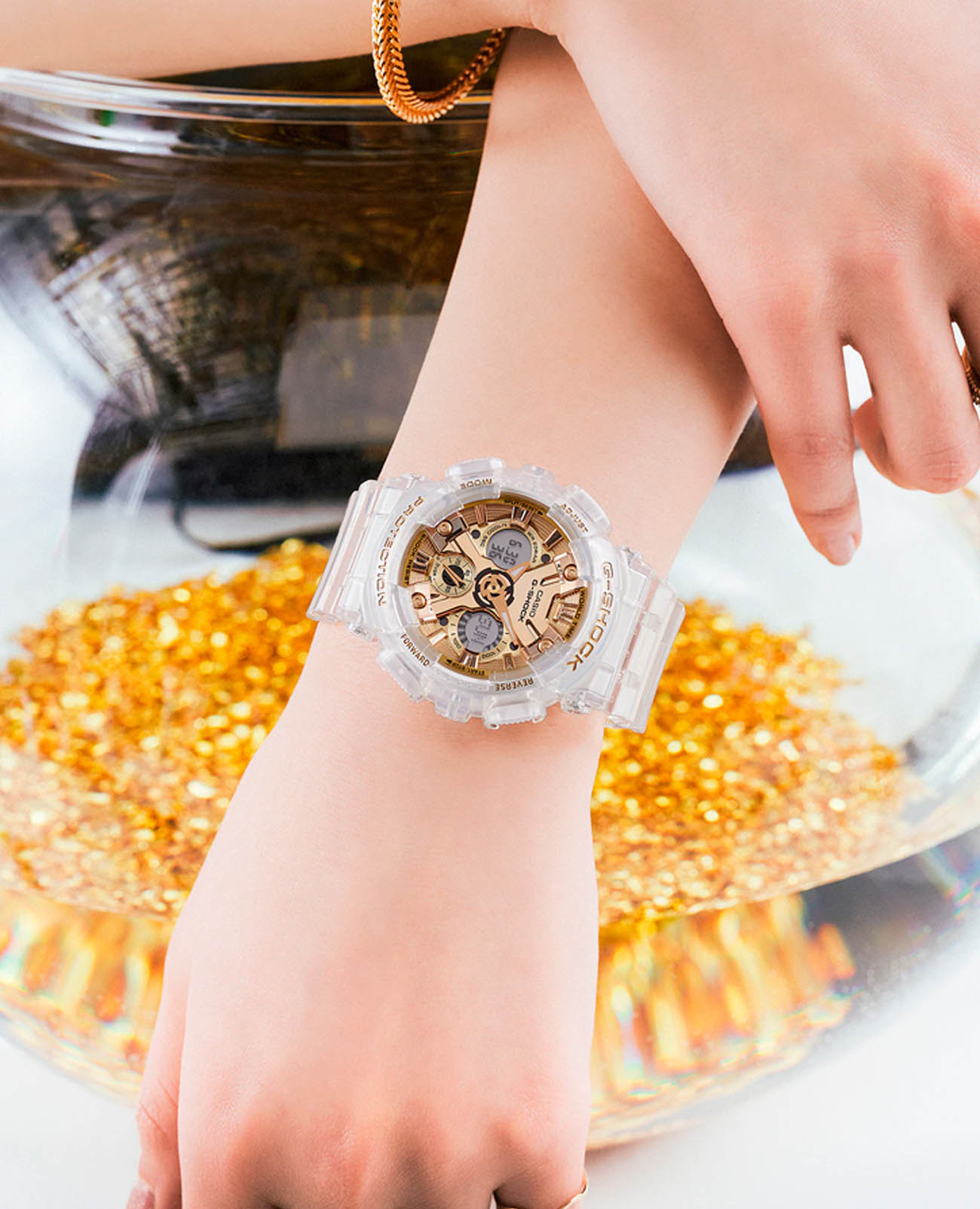 Японские женские часы-хронографХронографФункция позволяет измерять отрезки времени с особой точностью: часы, минуты, секунды. Верным признаком хронографа является наличие на циферблате 3 дополнительных окошек-счётчиков. Casio G-Shock GMA-S120SG-7AER. Стильная и лаконичная фешн-модель в полупрозрачном корпусе из серии G-SHOCK S SERIES с аналого-цифровым циферблатом золотого цвета. Без сомнения, эти яркие и аутентичные джишоки способны приковать к себе внимание и украсить любое, даже самое изящное женское запястье. Минеральное стеклоМинеральное стеклоМинеральное стекло представляет собой искусственно выращенный минерал кварца. Такое стекло отличается особой устойчивостью к повреждениям и царапинам. Уступает по некоторым качествам сапфировому стеклу. устойчивое к появлению царапин, обладающее высокой прозрачностью. Ударопрочный корпусУдаропрочный корпусМеханизм заключён в корпус, выполненный из современных материалов, устойчивых к ударам, механическим повреждениям и падению с высоты: инновационный пластик, карбон, нержавеющая сталь, титан. защищает механизм от ударов и вибрации. Многокомпонентный циферблат состоит из цифровых окошек указателей числа и дня недели, а также индикатора режима работы часов, который расположен в позиции 9 часов и выполнен в виде пропеллера. Светодиодная автоподсветка - при повороте часов в сторону лица подсветка дисплея осуществляется автоматически. Настраиваемое послесвечение 1,5 или 3сек. Мировое времяМировое время Полезное часовое усложнение, отображающее время в основных городах и известных областях по всему миру, оно связано с часовыми поясами, удобно для путешественников и бизнесменов. – 48 городов (29 часовых поясов). СекундомерСекундомерСекундоме́р — прибор, способный измерять интервалы времени с точностью до долей секунды. с точностью измерения 1/100 секунды и измерением до 23 часов 59 минут 59,99 cек. ТаймерТаймерОтсчитывает секунды в обратном направлении в заданном интервале времени. обратного отсчета (диапазон времени 24 часа), автоматический календарь, 12/24 отображение времени. 5 будильниковБудильникБуди́льник — часы, в заданный момент времени подающие звуковой, световой и/или в редких случаях другой сигнал., один с функцией Snooze, ежечасный сигнал. Класс водозащиты: 200 метров, позволит плавать, нырять и заниматься другими водными видами спорта. Ремешок из полимерного материала на стандартной застежке.
