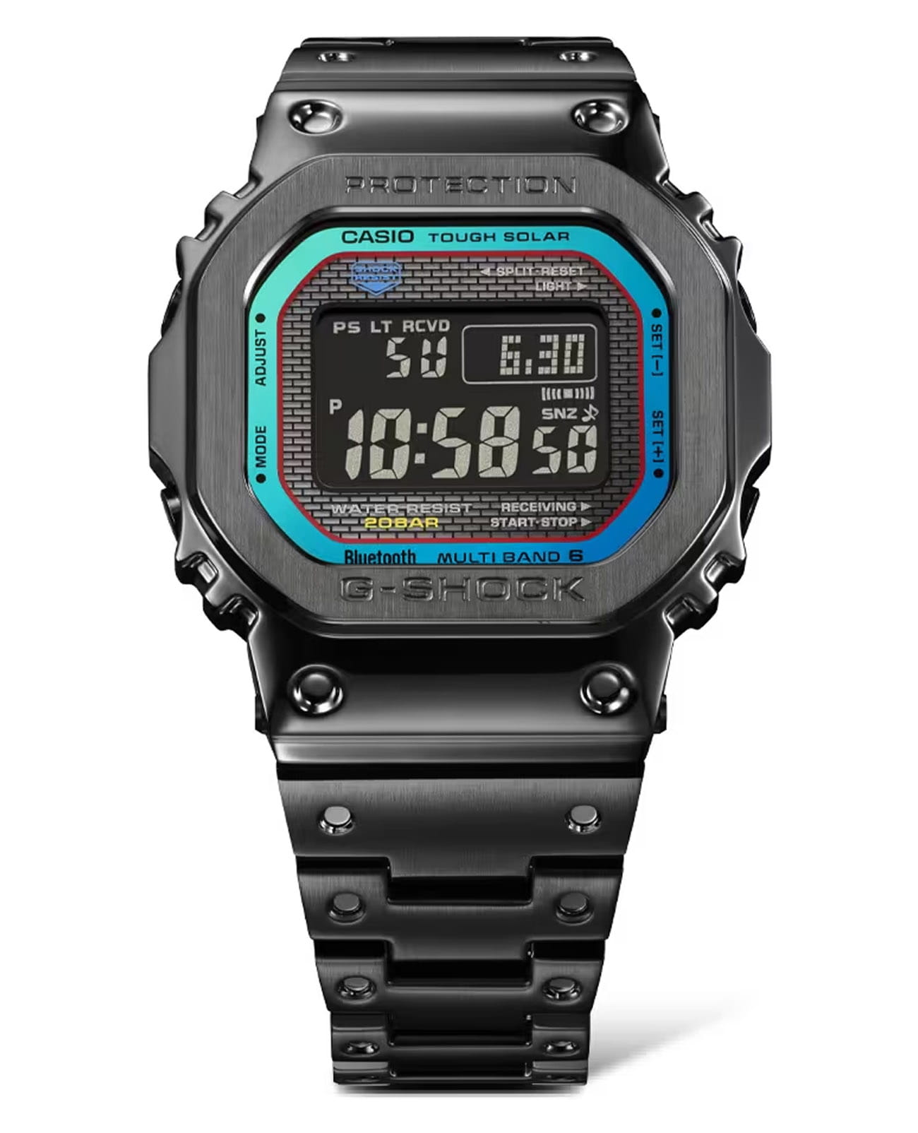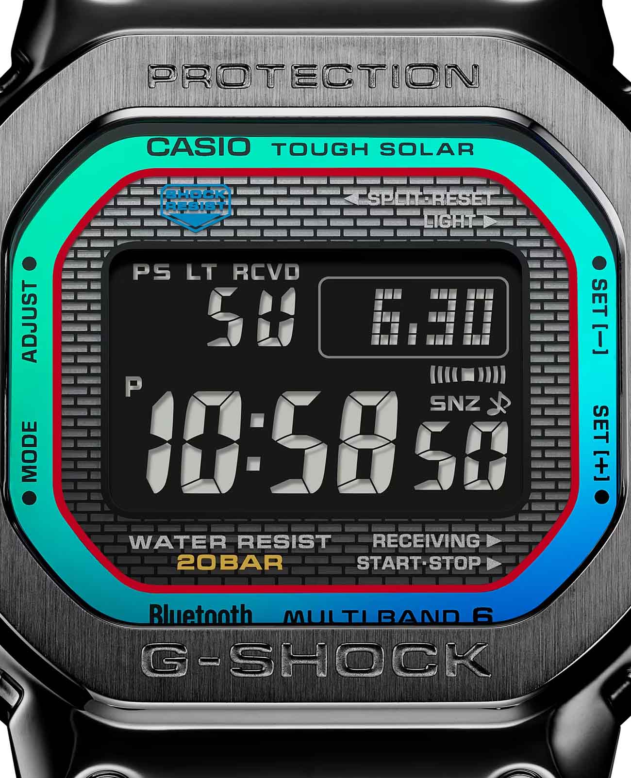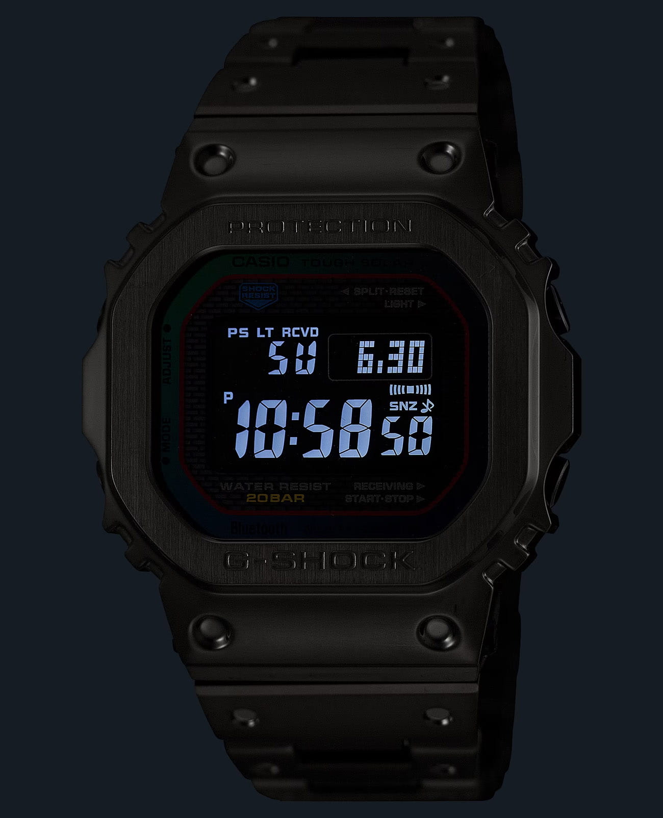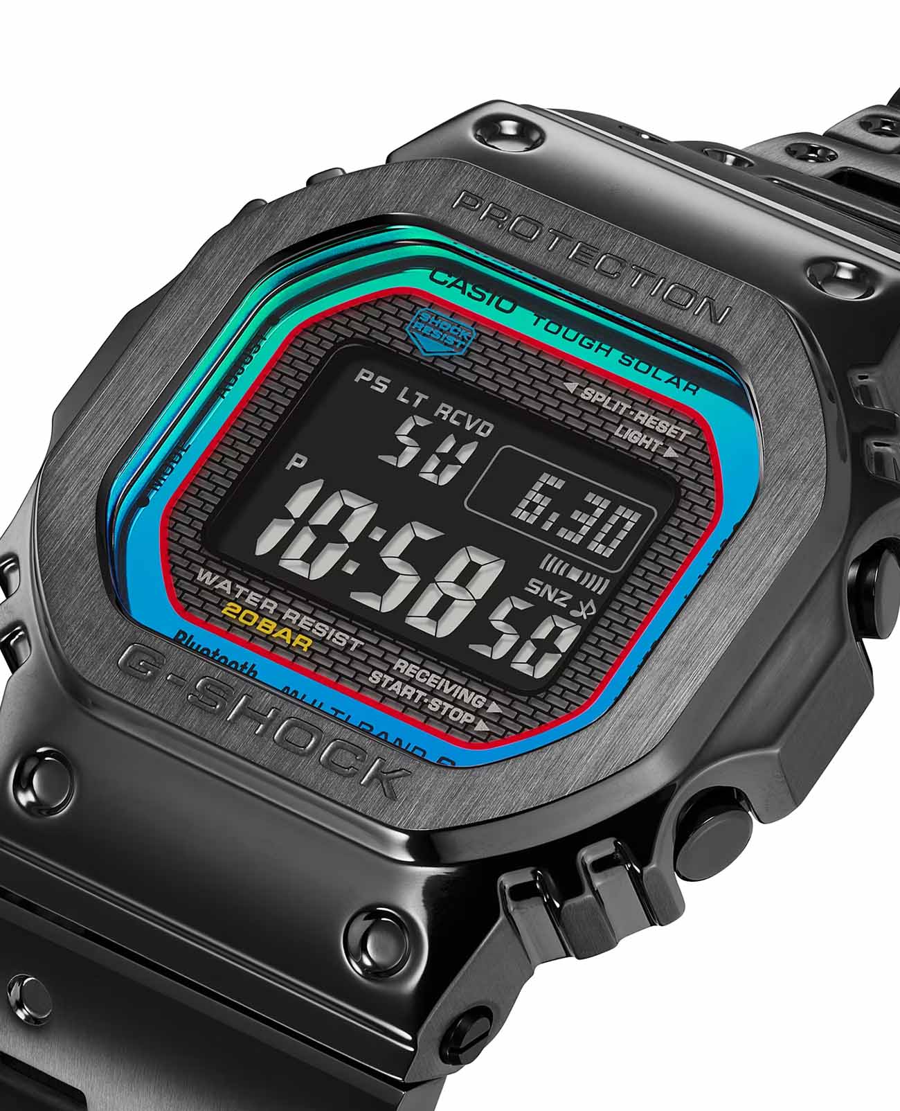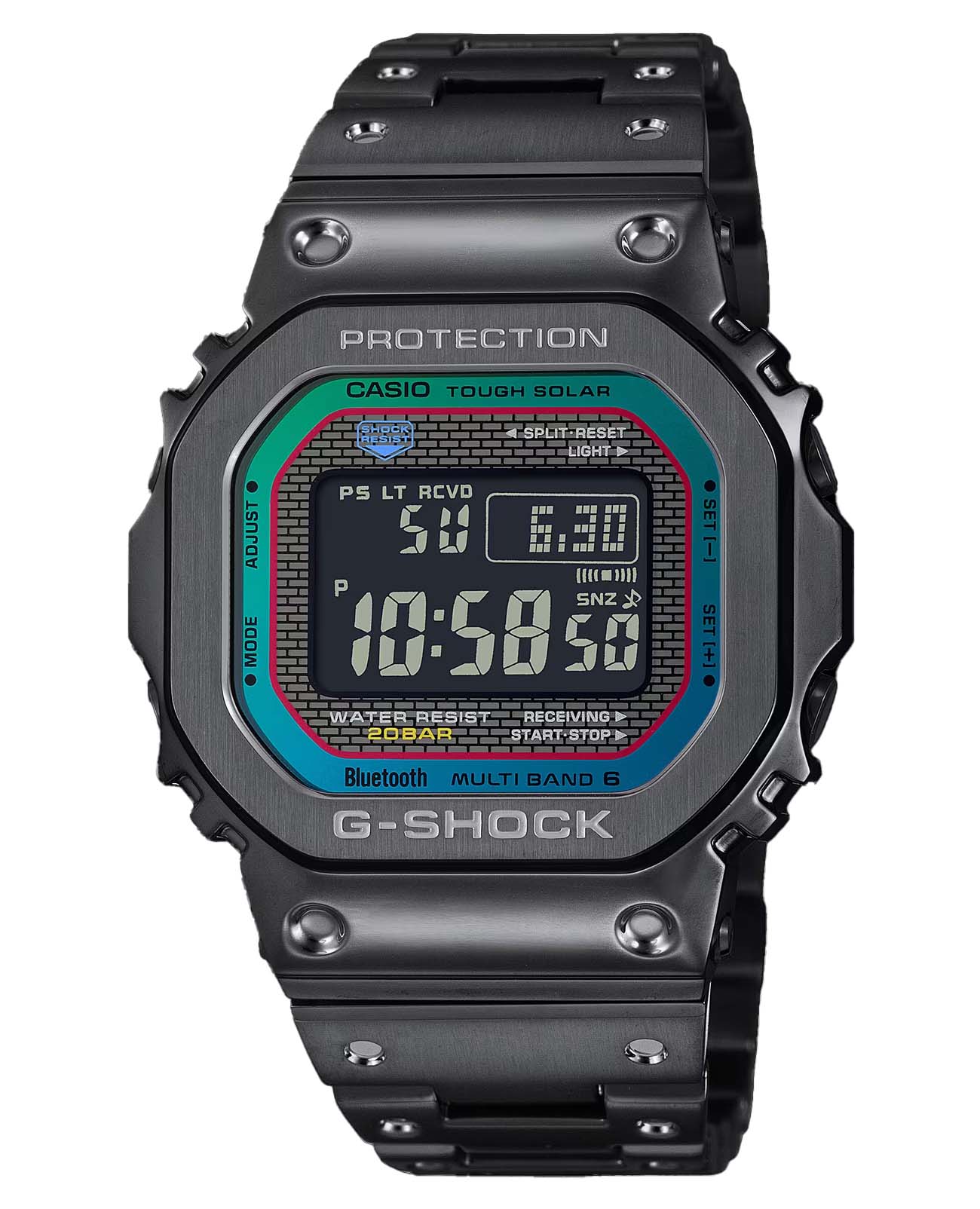 Японские мужские часы Casio G-Shock GMW-B5000BPC-1. Минеральное стеклоМинеральное стеклоМинеральное стекло представляет собой искусственно выращенный минерал кварца. Такое стекло отличается особой устойчивостью к повреждениям и царапинам. Уступает по некоторым качествам сапфировому стеклу. устойчивое к появлению царапин, обладающее высокой прозрачностью. Ударопрочный корпусУдаропрочный корпусМеханизм заключён в корпус, выполненный из современных материалов, устойчивых к ударам, механическим повреждениям и падению с высоты: инновационный пластик, карбон, нержавеющая сталь, титан. и ремешок выполнены из нержавеющей стали с IP-покрытиемIP-покрытиеМетод ионного напыления. Демонстрирует повышенную устойчивость к истиранию, окислению и химическим веществам. Под воздействием высокого давления и температуры около 1500°C молекулы металла надёжно соединяются с частицами корпуса часов., обеспечивающий максимально высокий уровень защиты часов от механических повреждений. Tough SolarTough SolarТехнология основана на подзарядке аккумулятора от источника солнечного света, специальная панель улавливает солнечные лучи и преобразует их в энергию для работы часов. Достаточно пары минут нахождения на солнце для функционирования часов в течении суток.. Часы оснащены технологией BluetoothBluetoothСовременная технология, позволяющая синхронизировать часы с телефоном и переносить данные. Часы с Bluetooth расширяют возможности вашего смартфона и делают его использование ещё более удобным., которая предлагает энергосберегающую возможность передачи данных нажатием кнопки. С помощью Bluetooth вы можете подключить часы к смартфону, не используя провод, и получить доступ к целому ряду полезных функций. Если часы подключены к смартфону, время устанавливается автоматически. Мировое времяМировое время Полезное часовое усложнение, отображающее время в основных городах и известных областях по всему миру, оно связано с часовыми поясами, удобно для путешественников и бизнесменов. в 29 различных часовых поясах. БудильникБудильникБуди́льник — часы, в заданный момент времени подающие звуковой, световой и/или в редких случаях другой сигнал., секундомерСекундомерСекундоме́р — прибор, способный измерять интервалы времени с точностью до долей секунды., таймерТаймерОтсчитывает секунды в обратном направлении в заданном интервале времени. и функция поиска телефона. После нажатия на кнопку, ваш потерянный телефон издаст звуковой сигнал. Класс водозащиты: 200 метров, позволит плавать, нырять и заниматься другими водными видами спорта. Стальной браслет с IP-покрытиемIP-покрытиеМетод ионного напыления. Демонстрирует повышенную устойчивость к истиранию, окислению и химическим веществам. Под воздействием высокого давления и температуры около 1500°C молекулы металла надёжно соединяются с частицами корпуса часов. на раскладной застёжкеРаскладная застёжкаТакой тип застёжки используется только на браслетах из металла. Она никогда не раскрывается полностью, происходит разделение на 2 и более частей. Раскладывающая застёжка снизит вероятность потери часов к минимуму..
