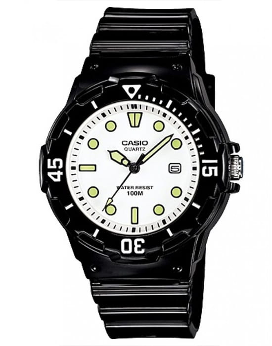 Часы в спортивном стиле полностью подойдут для пляжного отдыха. Корпус и браслет выполнены из высокопрочных полимерных материалов. На аккуратном циферблате расположены временные отметки в виде штрихов и миниатюрное окошечко с календарем. Люминесцентная подсветкаЛюминесцентное покрытиеПозволяет считывать показания времени в темноте. Производители наносят на стрелки, часовые индексы, безель или поверхность циферблата светонакопительный состав, дающий холодное свечение.. Высокая водонепроницаемость в 100 WR идеально подходит для плавания в воде. Небольшой вес в 25 грамм не создаст ощущения тяжести при ношении аксессуара.