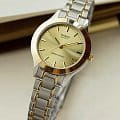 Японские кварцевые женские часы из коллекции LTP с минеральным стекломМинеральное стеклоМинеральное стекло представляет собой искусственно выращенный минерал кварца. Такое стекло отличается особой устойчивостью к повреждениям и царапинам. Уступает по некоторым качествам сапфировому стеклу. Casio Collection LTP-1128G-9A изящно смотрятся на запястье, они привлекают классическим исполнением и правильной геометрией. Минималистичная модель станет отличным решением для любого случая: на работу, переговоры с деловыми партнёрами, прогулку с друзьями или праздничный вечер. Отсутствуют лишние детали, что позволяет часам быть актуальными на долгие годы. Корпус и браслет выполнен из нержавеющей стали с частичным IP-покрытиемIP-покрытиеМетод ионного напыления. Демонстрирует повышенную устойчивость к истиранию, окислению и химическим веществам. Под воздействием высокого давления и температуры около 1500°C молекулы металла надёжно соединяются с частицами корпуса часов.. Стальной браслет на раскладной застёжкеРаскладная застёжкаТакой тип застёжки используется только на браслетах из металла. Она никогда не раскрывается полностью, происходит разделение на 2 и более частей. Раскладывающая застёжка снизит вероятность потери часов к минимуму.. Циферблат с метками в виде штрихов выполнен по технологии Sunray (солнечные лучи)