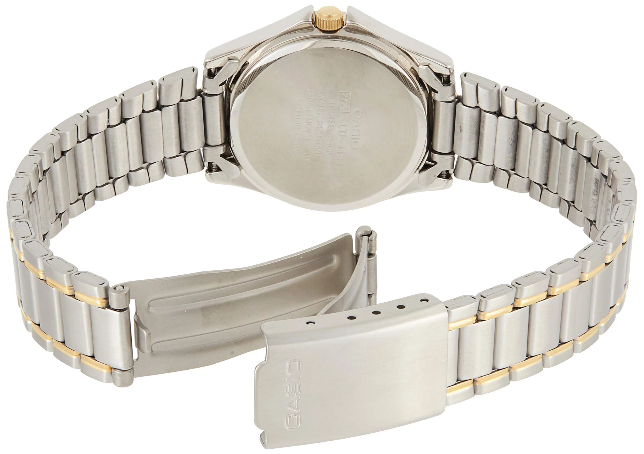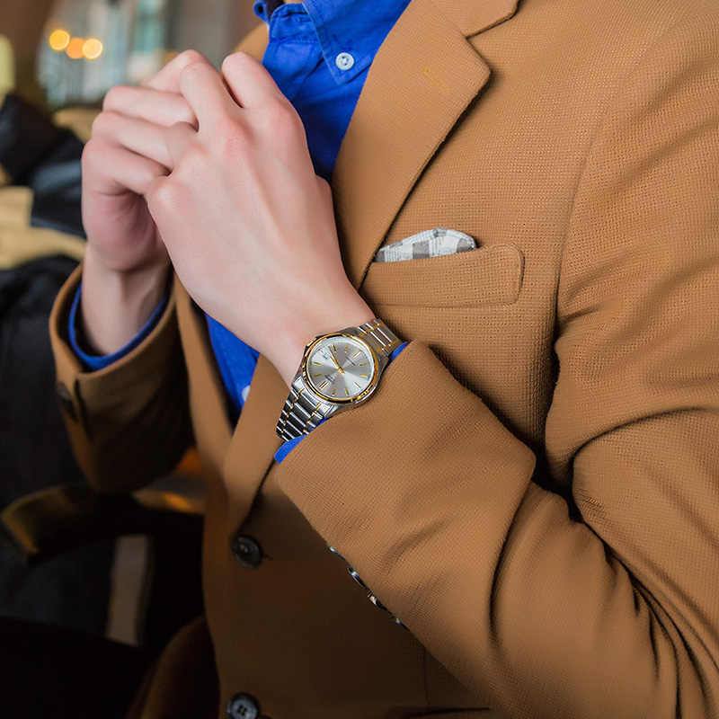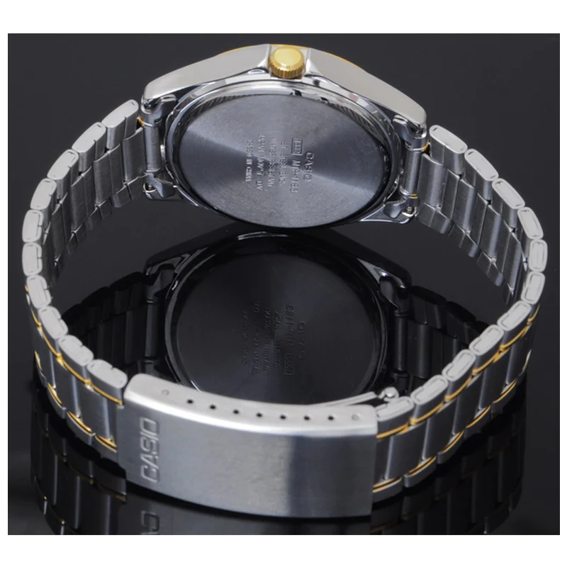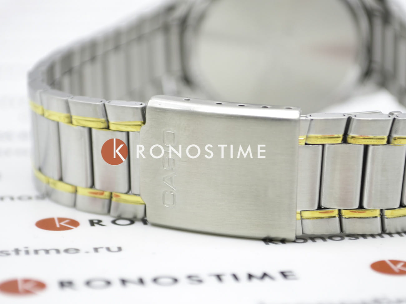 Японские мужские наручные часы с минеральным стекломМинеральное стеклоМинеральное стекло представляет собой искусственно выращенный минерал кварца. Такое стекло отличается особой устойчивостью к повреждениям и царапинам. Уступает по некоторым качествам сапфировому стеклу. MTP-1183G-7A, кварцевый механизм с высокой точностью. Класс водозащиты: 30 метров, позволит защитить корпус от случайных брызг или капель дождя. Корпус и браслет часов изготовлен из стали с IP-покрытиемIP-покрытиеМетод ионного напыления. Демонстрирует повышенную устойчивость к истиранию, окислению и химическим веществам. Под воздействием высокого давления и температуры около 1500°C молекулы металла надёжно соединяются с частицами корпуса часов.. Окошко даты находится в положении 3 часа.Стальной браслет на раскладной застёжкеРаскладная застёжкаТакой тип застёжки используется только на браслетах из металла. Она никогда не раскрывается полностью, происходит разделение на 2 и более частей. Раскладывающая застёжка снизит вероятность потери часов к минимуму..