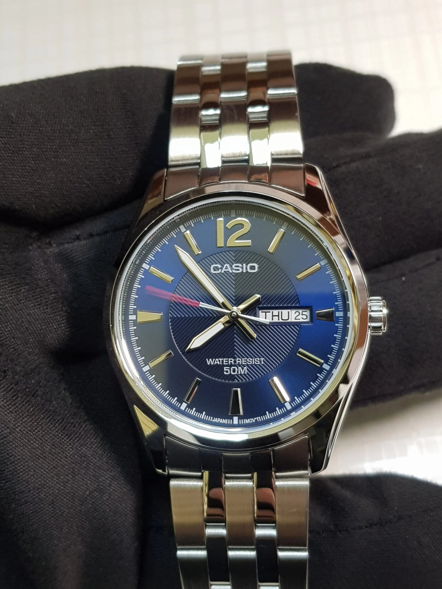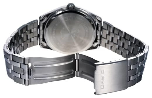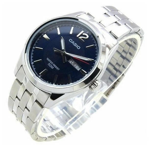 Японские мужские часы с минеральным стекломМинеральное стеклоМинеральное стекло представляет собой искусственно выращенный минерал кварца. Такое стекло отличается особой устойчивостью к повреждениям и царапинам. Уступает по некоторым качествам сапфировому стеклу. Casio MTP-1335D-2A, кварцевый механизм с высокой точностью. Класс водозащиты: 50 метров, позволит защитить корпус от случайных брызг или капель дождя. Корпус часов изготовлен из стали. Стальной браслет на раскладной застёжкеРаскладная застёжкаТакой тип застёжки используется только на браслетах из металла. Она никогда не раскрывается полностью, происходит разделение на 2 и более частей. Раскладывающая застёжка снизит вероятность потери часов к минимуму.. Стрелки с люминесцентным покрытиемЛюминесцентное покрытиеПозволяет считывать показания времени в темноте. Производители наносят на стрелки, часовые индексы, безель или поверхность циферблата светонакопительный состав, дающий холодное свечение.. Окошки дня недели и даты находятся в положении 3 часа.