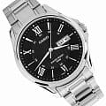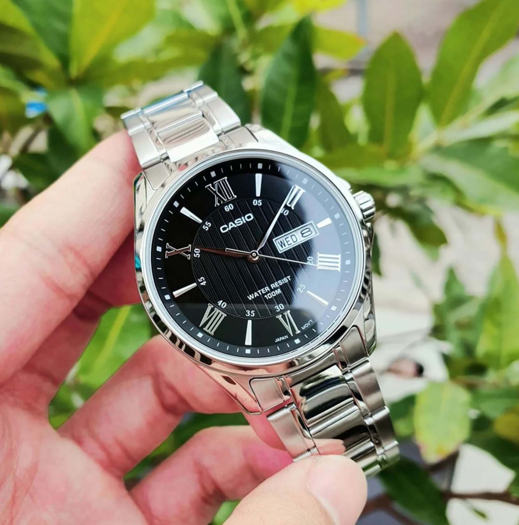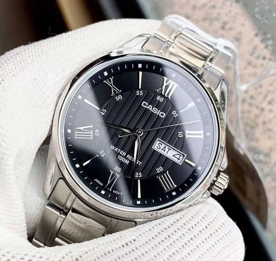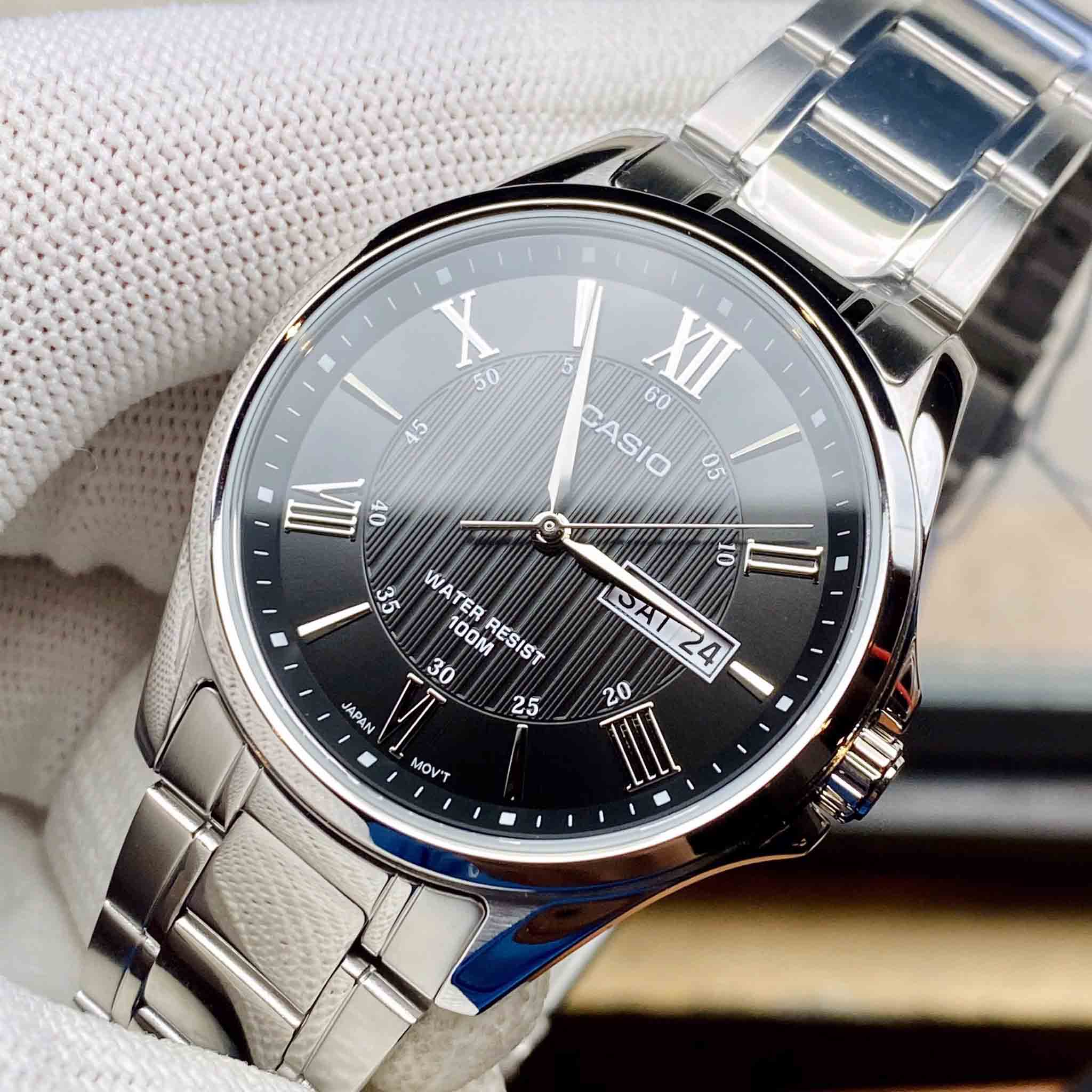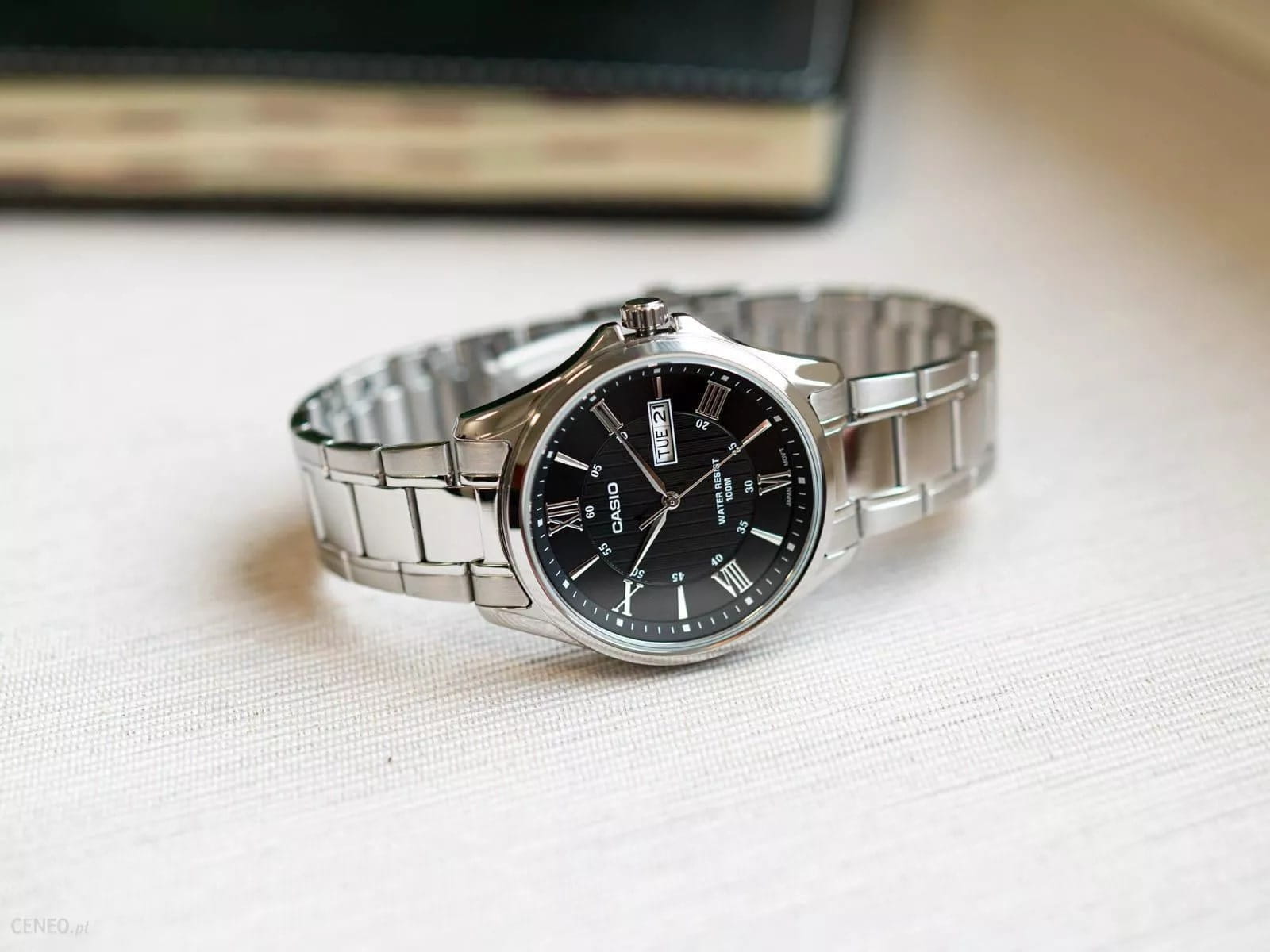 Японские мужские наручные часы с минеральным стекломМинеральное стеклоМинеральное стекло представляет собой искусственно выращенный минерал кварца. Такое стекло отличается особой устойчивостью к повреждениям и царапинам. Уступает по некоторым качествам сапфировому стеклу. Casio Collection MTP-1384D-1A, кварцевый механизм с высокой точностью. Класс водозащиты: 100 метров, позволит плавать, нырять и заниматься другими водными видами спорта. Корпус часов изготовлен из стали. Стальной браслет на раскладной застёжкеРаскладная застёжкаТакой тип застёжки используется только на браслетах из металла. Она никогда не раскрывается полностью, происходит разделение на 2 и более частей. Раскладывающая застёжка снизит вероятность потери часов к минимуму.. Окошки дня недели и даты находятся в положении 3 часа. Задняя крышка с винтовым фиксатором. Заводная головка с защитой.