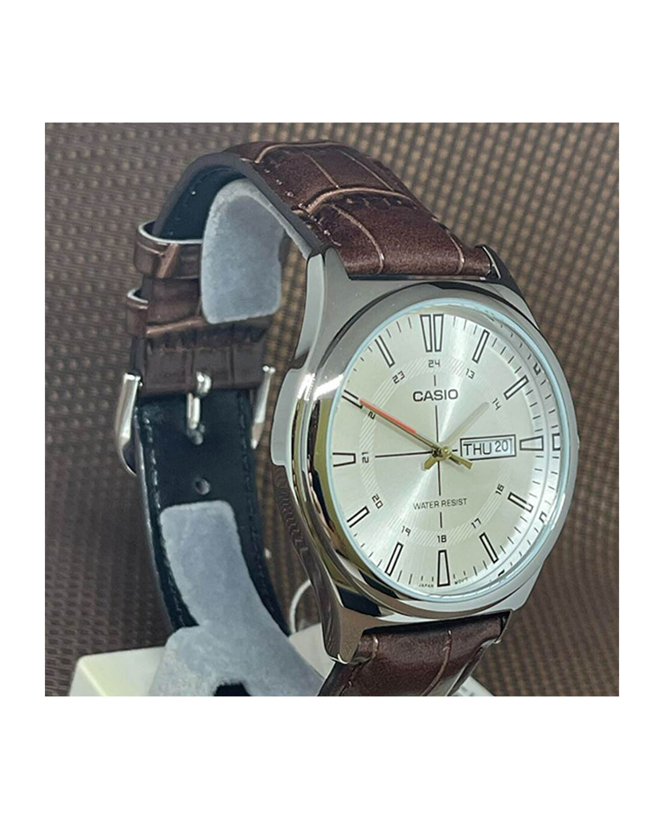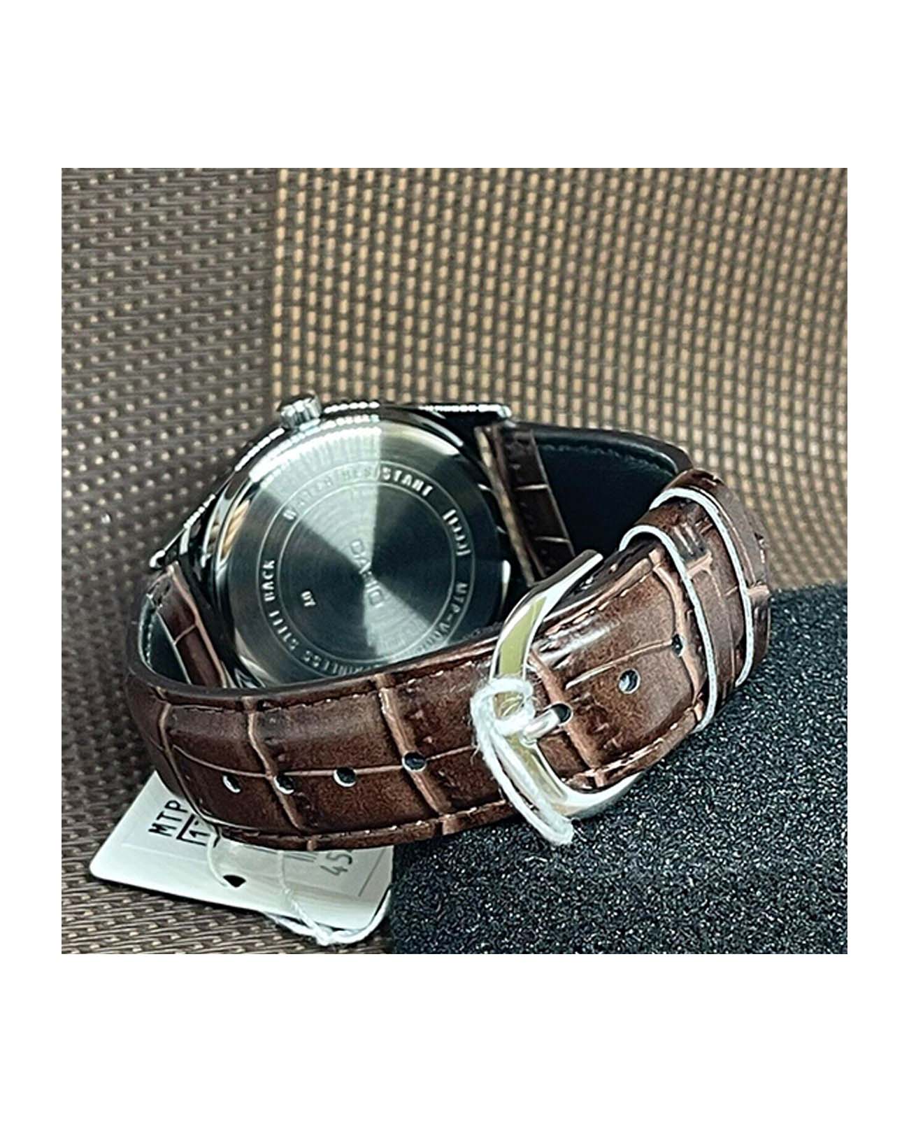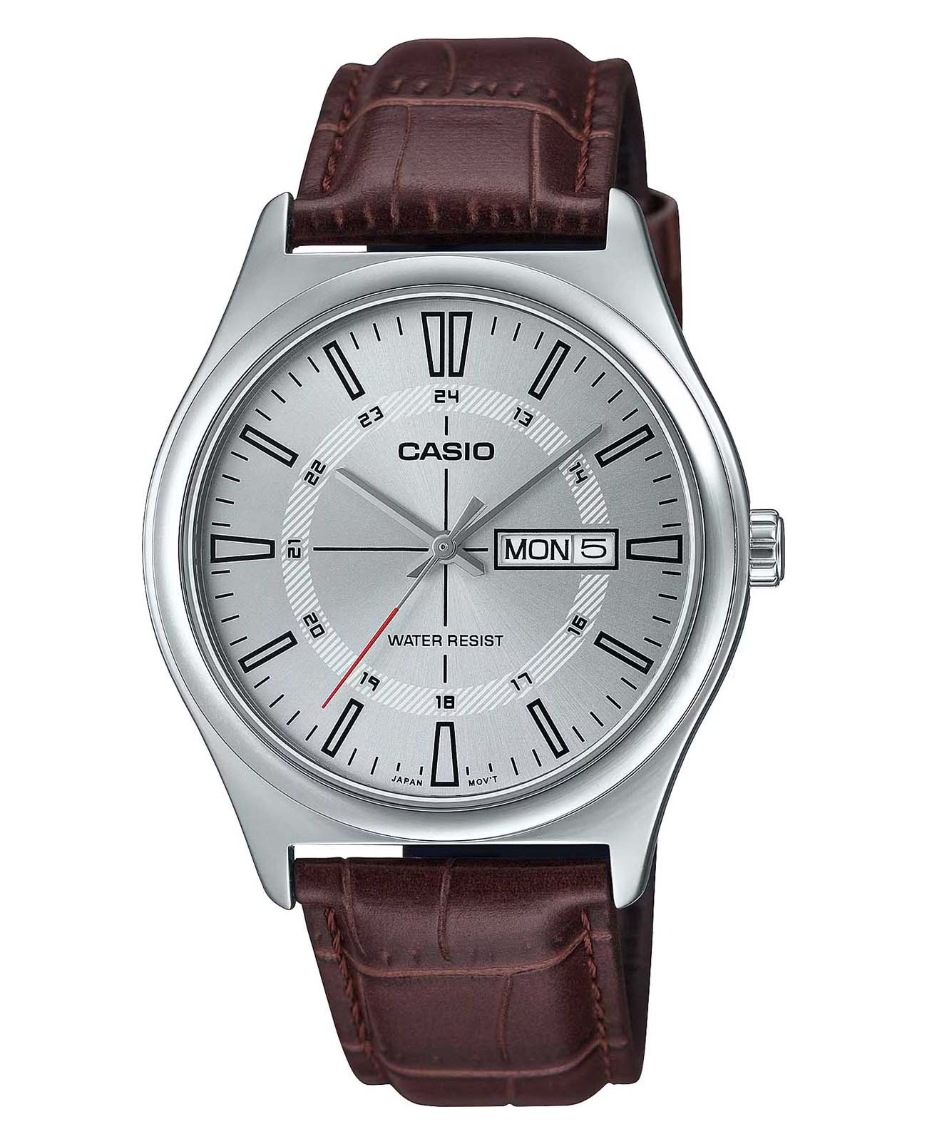 Японские мужские кварцевые часы с минеральным стекломМинеральное стеклоМинеральное стекло представляет собой искусственно выращенный минерал кварца. Такое стекло отличается особой устойчивостью к повреждениям и царапинам. Уступает по некоторым качествам сапфировому стеклу. Casio Collection MTP-V006L-7C, кварцевый механизм с высокой точностью. Корпус и браслет часов изготовлен из нержавеющей стали. 12-ти и 24-х часовой формат времени. Циферблат с метками в виде штрихов выполнен по технологии Sunray (солнечные лучи). Рифленая заводная головка. Класс водозащиты: 30 метров, позволит защитить корпус от случайных брызг или капель дождя. Кожаный ремешок на стандартной застежке.