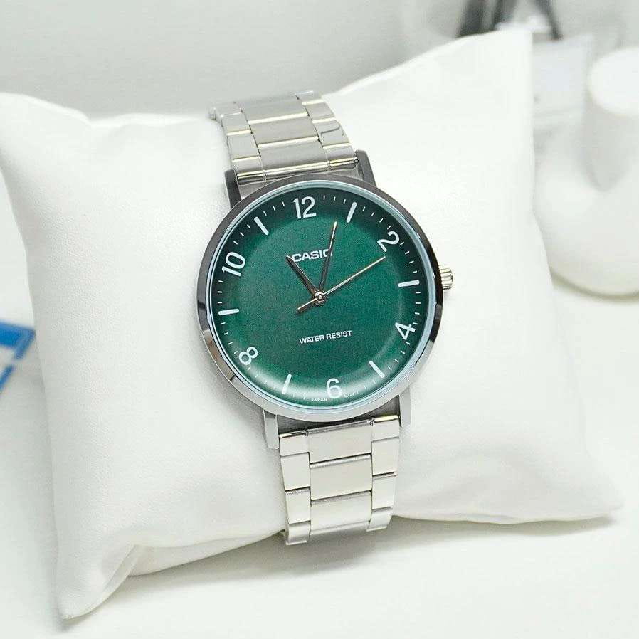 Мужские кварцевые часы Casio Collection — это универсальный аксессуар на каждый день. Корпус размером 46 мм и толщиной 8,2 мм выполнен из нержавеющей стали. Циферблат зелёного цвета оформлен штрихами, арабскими цифрами и стрелками. Циферблат защищён минеральным стекломМинеральное стеклоМинеральное стекло представляет собой искусственно выращенный минерал кварца. Такое стекло отличается особой устойчивостью к повреждениям и царапинам. Уступает по некоторым качествам сапфировому стеклу.. Часы оснащены стальным браслетом из нержавеющей стали на раскладной застёжкеРаскладная застёжкаТакой тип застёжки используется только на браслетах из металла. Она никогда не раскрывается полностью, происходит разделение на 2 и более частей. Раскладывающая застёжка снизит вероятность потери часов к минимуму.. Водонепроницаемость 30 м позволяет использовать часы в повседневных условиях. Идеальный выбор для тех, кто ценит японское качество и универсальный дизайн.