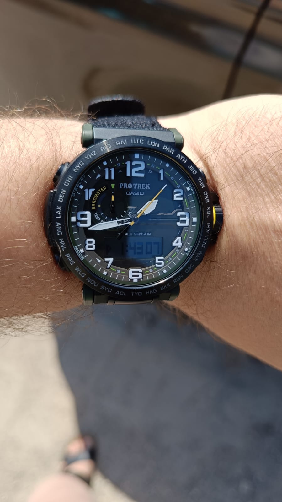 Любое ваше путешествие выйдет на новый уровень благодаря этим часам из коллекции Pro Trek. Casio Pro Trek PRG-601YB-3 для активного отдыха. Корпус и ремешок выполнены из биопластика, который изготавливается из возобновляемых органических ресурсов. Питание от солнечной энергии Tough SolarTough SolarТехнология основана на подзарядке аккумулятора от источника солнечного света, специальная панель улавливает солнечные лучи и преобразует их в энергию для работы часов. Достаточно пары минут нахождения на солнце для функционирования часов в течении суток. - солнечные батарейки большой мощности, индикатор заряда батареи. Функция автоматического сохранения энергии. Время работы аккумулятора без подзарядки приблизительно 7 месяцев, при включенной функции сохранения энергии приблизительно 25 месяцев. Модуль часов рассчитан на работу при низких температурах до -10°С/14°F. Двойная подcветка: циферблат и ЖК-дисплеи подсвечиваются светодиодом, благодаря наличию функции задержки, после отпускания кнопки освещение горит еще несколько секунд. Настраиваемое послесвечение 1,5 или 3сек. Цвет подсветки: белый. Необритовое покрытиеПодсветка NeobriteИспользование светонакопительных составов на основе сульфида цинка или алюмината стронция, яркий свет можно наблюдать на протяжении 6-10 часов после «зарядки» часов около источника света. обеспечивает длительное послесвечение в темноте даже после кратковременного нахождения на свету. 12-ти и 24-х часовой формат времени. СекундомерСекундомерСекундоме́р — прибор, способный измерять интервалы времени с точностью до долей секунды. с точностью показаний 1/100с и временем измерения 24ч. Сплит-хронографСплит-хронографИспользуется для измерения продолжительности нескольких временных отрезков, начинающихся одновременно, а заканчивающихся в разное время.. ТаймерТаймерОтсчитывает секунды в обратном направлении в заданном интервале времени. обратного отсчета от 1с до 1ч. Мировое времяМировое время Полезное часовое усложнение, отображающее время в основных городах и известных областях по всему миру, оно связано с часовыми поясами, удобно для путешественников и бизнесменов. – 29 городов (29 часовых поясов), всемирное координированное время (UTC). Функция включения/отключения летнего времени. Функция автоматической коррекции положения стрелок проверяет положение стрелок каждый час и корректирует его в случае необходимости. Технология Triple Sensor позволяет точно и легко определять сторону света, температуру и атмосферное давление. Термометр от -10° до +60°С с точностью 0,1°C. Барометр - измерение атмосферного давления от 260 до 1100 гПа (от 195 до 825 мм рт. ст.). Встроенный цифровой компас. Диапазон измерения от 0° до 359° с точностью 1°. Высотомер - встроенный датчик барометрического давления с возможностью вывода результатов в единицах высоты над уровнем моря (от -700 до 10000 метров). График набора высоты. Хранение до 30 записей о высотных точках рельефа местности - измеренной абсолютной высоты, даты и времени. Система Smart Access с помощью электронной заводной головки обеспечивает простой и удобный доступ ко всем важным функциям часов. Нажатие или поворот заводной головки позволяет переключаться между различными режимами и активировать будильникБудильникБуди́льник — часы, в заданный момент времени подающие звуковой, световой и/или в редких случаях друго