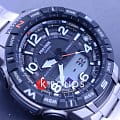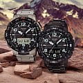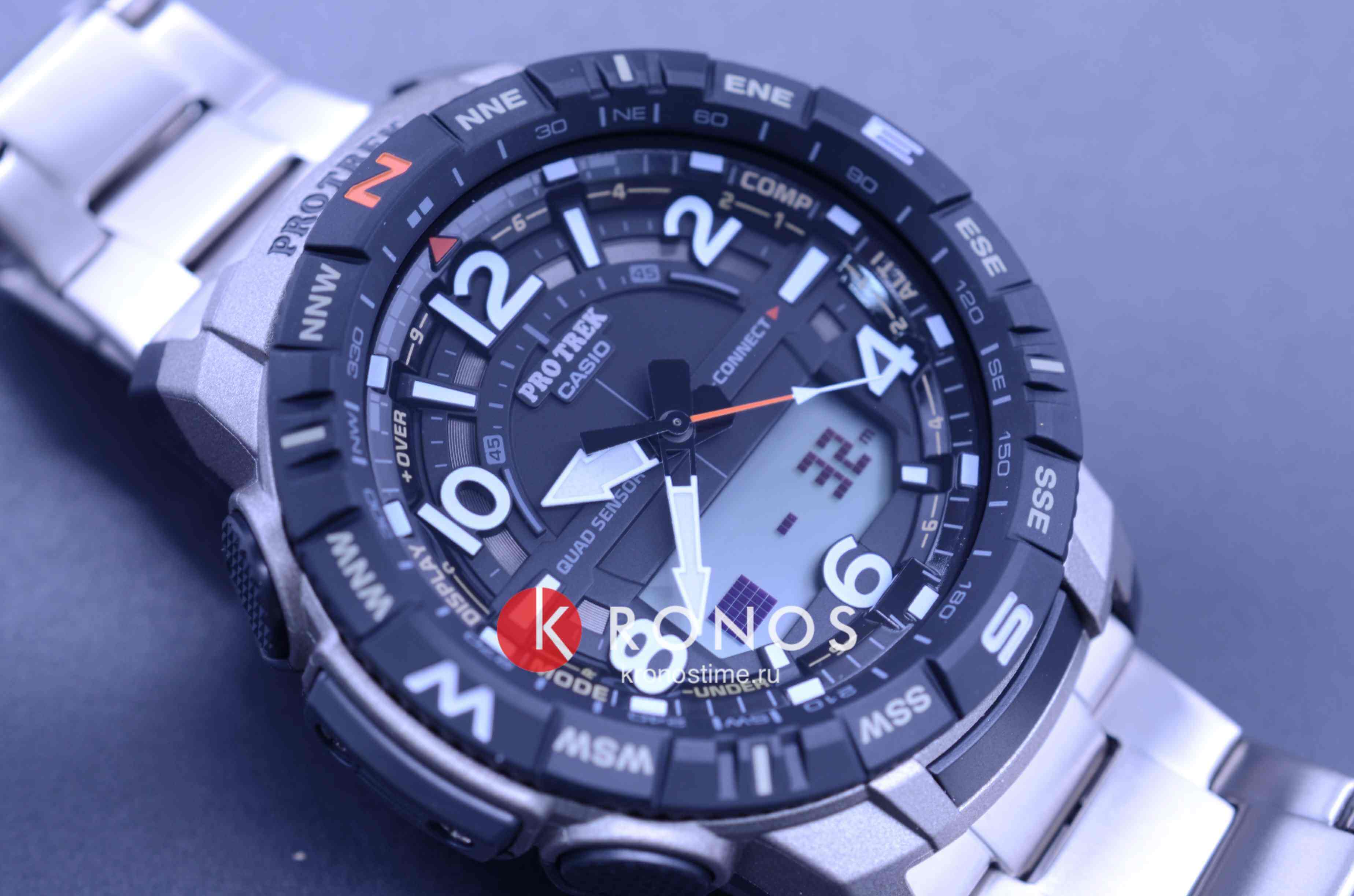 Аксессуар представлен в спортивном стиле, внимание привлекают угловатые детали и крупные габариты. Наручные часы в серебристо-чёрной расцветке оснащены множеством функций, необходимых для активного времяпрепровождения на природе, решения повседневных задач. Это термометр -10°C /+60°C, компас, барометр, график восхода и заката солнца, высотомер, мировое времяМировое время Полезное часовое усложнение, отображающее время в основных городах и известных областях по всему миру, оно связано с часовыми поясами, удобно для путешественников и бизнесменов. , шагомер, хронографХронографФункция позволяет измерять отрезки времени с особой точностью: часы, минуты, секунды. Верным признаком хронографа является наличие на циферблате 3 дополнительных окошек-счётчиков., будильник, календарь. Японский кварцевый механизм с точностью хода -/+15 секунд в месяц получает питание от батарейки, рассчитанной на 2-летний срок службы. Ударопрочный корпусУдаропрочный корпусМеханизм заключён в корпус, выполненный из современных материалов, устойчивых к ударам, механическим повреждениям и падению с высоты: инновационный пластик, карбон, нержавеющая сталь, титан. сделан из полимера, идеальным дополнением к нему стал титановый браслет с IP-покрытиемIP-покрытиеМетод ионного напыления. Демонстрирует повышенную устойчивость к истиранию, окислению и химическим веществам. Под воздействием высокого давления и температуры около 1500°C молекулы металла надёжно соединяются с частицами корпуса часов.. Электролюминесцентная подсветкаЭлектролюминесцентная подсветкаЭлектролюминесцентная панель устанавливается под ЖК-экраном часов, при нажатии кнопки электричество преобразуется в свет за счёт подачи напряжения на атомы фосфора, такой тип подсветки позволяет освещать весь циферблат. освещает дисплей, светодиодСветодиодная подсветкаСветодиодная или LED-подсветка обеспечивает появление яркого холодного свечения за счёт LED-элементов - маленьких лампочек. Они потребляют минимальное количество энергии, чаще всего можно встретить 1 светодиод, в нижней части циферблата. применяется для циферблата. Минеральное стекло защищает циферблат от повреждений, отличается устойчивостью к царапинам. Класс водостойкости – WR 100, часы подходят для плавания. Габариты: 57,5 x 50,8 x 15,8 мм.