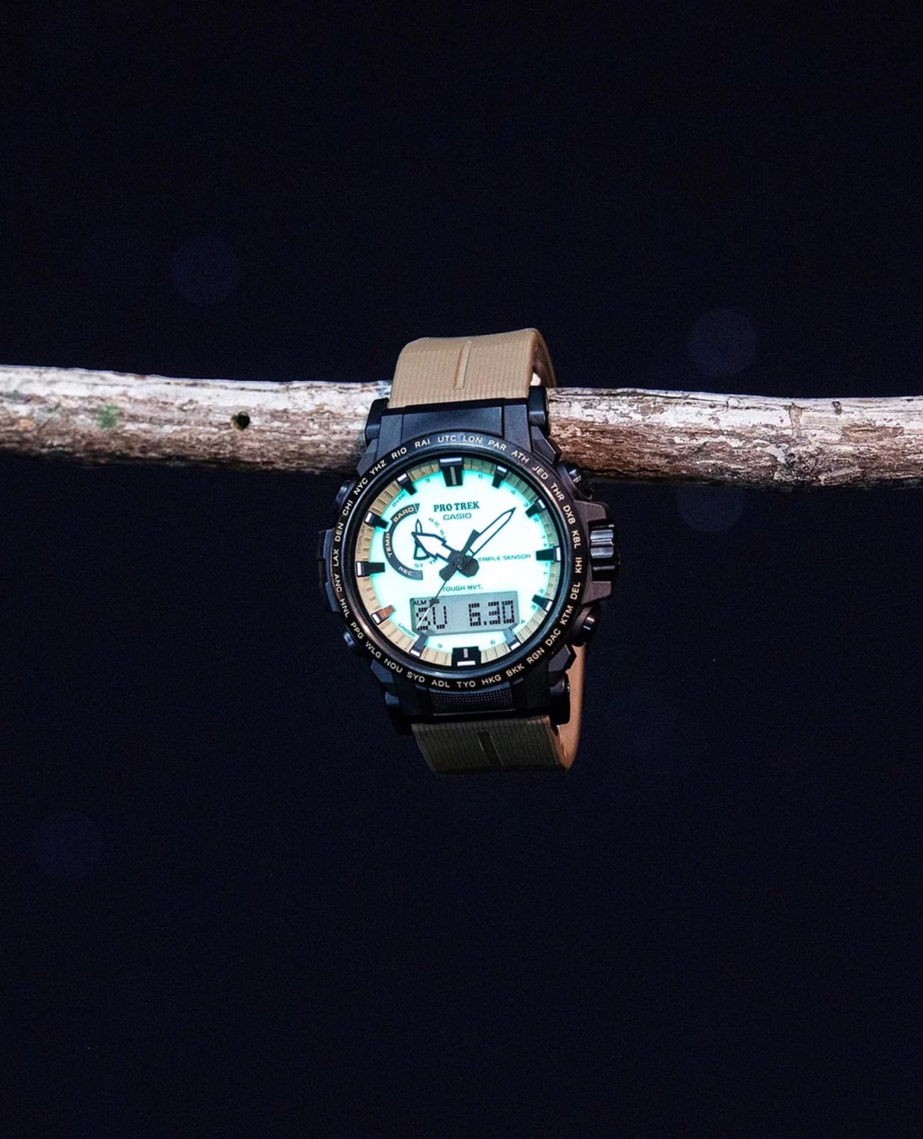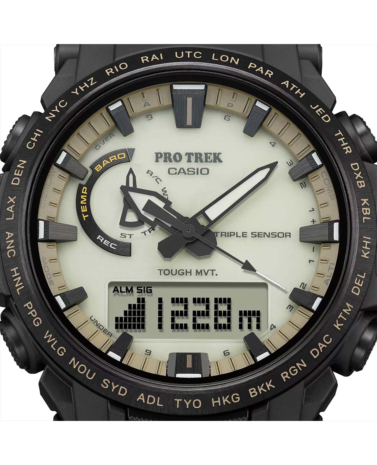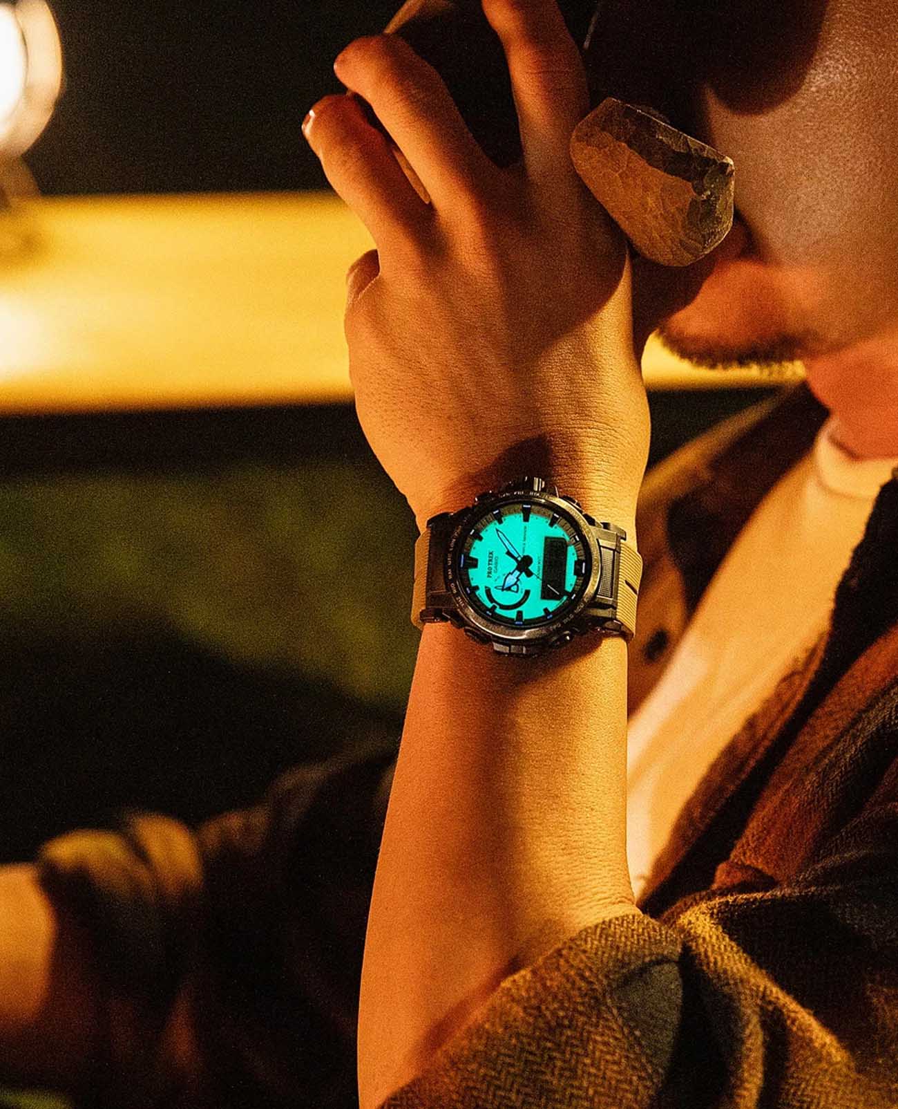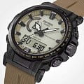 В целом же, дизайн корпуса PRW-61 остался узнаваем и даже с такой начинкой, в которой можно отметить водонепроницаемость корпуса, термометр, барометр, высотомер, цифровой компас, Tough SolarTough SolarТехнология основана на подзарядке аккумулятора от источника солнечного света, специальная панель улавливает солнечные лучи и преобразует их в энергию для работы часов. Достаточно пары минут нахождения на солнце для функционирования часов в течении суток. и радио-синхронизацию, часы отлично подходят в качестве ежедневного аксессуара для жителя современного города. Минеральное стеклоМинеральное стеклоМинеральное стекло представляет собой искусственно выращенный минерал кварца. Такое стекло отличается особой устойчивостью к повреждениям и царапинам. Уступает по некоторым качествам сапфировому стеклу. устойчивое к появлению царапин, обладающее высокой прозрачностью.