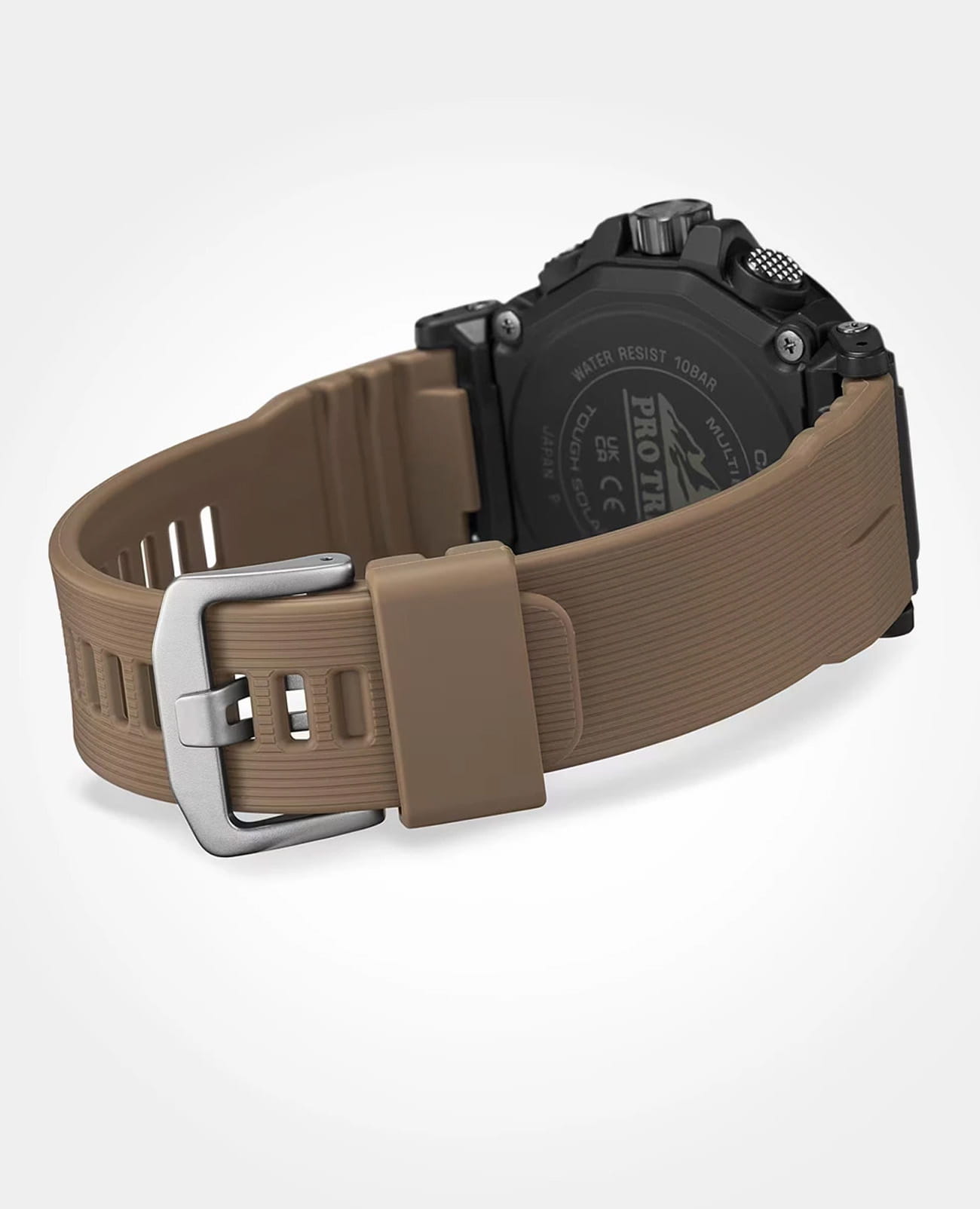Мужские японские часы Casio Pro Trek PRW-61LD-5 из коллекции Pro Trek отличаются расширенным функционалом на все случаи жизни. Перед вами модель один из флагманов PRO TREK в черном корпусе PRW-61. Данные часы на бежевом полимерном ремешке получили улучшенную структуру корпуса, более устойчивую к ударным нагрузкам и еще более эффективную солнечную батарею, чем их предшественники из знаменитой серии PRW-6000. Особенностью модели является светлый циферблат, полностью покрытый необрайтовым, светящимся в темноте составом.