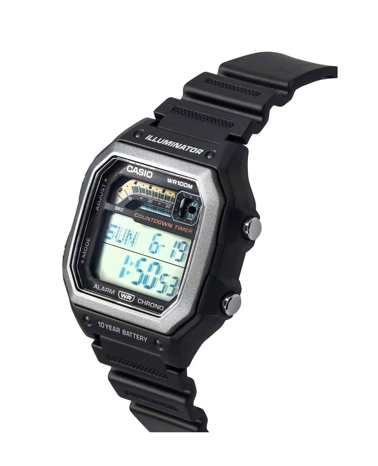 Японские мужские часы с секундомеромСекундомерСекундоме́р — прибор, способный измерять интервалы времени с точностью до долей секунды. Casio Collection WS-1600H-1A. Корпус изготовлен из пластика. Ежедневный будильникБудильникБуди́льник — часы, в заданный момент времени подающие звуковой, световой и/или в редких случаях другой сигнал.. Ежечасный сигнал. Автоматический календарь. ТаймерТаймерОтсчитывает секунды в обратном направлении в заданном интервале времени.. Функция мирового времениМировое время Полезное часовое усложнение, отображающее время в основных городах и известных областях по всему миру, оно связано с часовыми поясами, удобно для путешественников и бизнесменов. . Функция включения/выключения звука кнопок. Класс водозащиты: 100 метров, позволит плавать, нырять и заниматься другими водными видами спорта. Ремешок из полимерного материала на стандартной застежке.