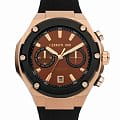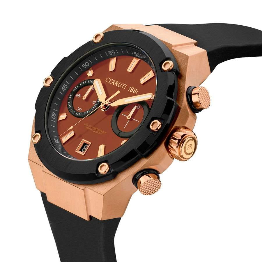 Мужские часы-хронографХронографФункция позволяет измерять отрезки времени с особой точностью: часы, минуты, секунды. Верным признаком хронографа является наличие на циферблате 3 дополнительных окошек-счётчиков. с секундомеромСекундомерСекундоме́р — прибор, способный измерять интервалы времени с точностью до долей секунды. Cerruti 1881 Lucardo CIWGO2206102 — это воплощение элегантности и современного стиля, сочетающее в себе передовые технологии и изысканный дизайн. Оснащенные кварцевым механизмом, эти часы обеспечивают высокую точность хода, что особенно важно для тех, кто ценит надежность и пунктуальность. Минеральное стеклоМинеральное стеклоМинеральное стекло представляет собой искусственно выращенный минерал кварца. Такое стекло отличается особой устойчивостью к повреждениям и царапинам. Уступает по некоторым качествам сапфировому стеклу. защищает циферблат от мелких механических повреждений, сохраняя его первоначальный блеск и ясность на протяжении долгого времени. Корпус часов изготовлен из качественной стали с золотистый IP-покрытиемIP-покрытиеМетод ионного напыления. Демонстрирует повышенную устойчивость к истиранию, окислению и химическим веществам. Под воздействием высокого давления и температуры около 1500°C молекулы металла надёжно соединяются с частицами корпуса часов., что придаёт конструкции прочность и устойчивость к внешним воздействиям. Особого внимания заслуживает безельБезельВнешний ободок, закрепляющий стекло. В спортивных часах так называется поворотное кольцо с делениями на циферблате, выполняет роль таймера – замеряет отрезки времени на шкале. Неподвижный безель – элемент декора. Однонаправленно вращающийся безель на дайверских часах позволяет фиксировать моменты погружения и выныривания на поверхность. с черным IP-покрытиемIP-покрытиеМетод ионного напыления. Демонстрирует повышенную устойчивость к истиранию, окислению и химическим веществам. Под воздействием высокого давления и температуры около 1500°C молекулы металла надёжно соединяются с частицами корпуса часов., который не только защищает часы, но и добавляет им изысканный вид. На циферблате расположены два дополнительных индикатора, которые делают функциональность часов ещё более широкой и удобной. Окошко даты, находящееся в положении 6 часов, обеспечивает дополнительное удобство, позволяя быстро и легко определить текущую дату. Стрелки и метки с люминесцентным покрытиемЛюминесцентное покрытиеПозволяет считывать показания времени в темноте. Производители наносят на стрелки, часовые индексы, безель или поверхность циферблата светонакопительный состав, дающий холодное свечение. обеспечивают отличную видимость даже в условиях недостаточного освещения. Класс водозащиты 100 метров позволяет владельцу не только плавать, но и нырять, а также заниматься другими водными видами спорта, не беспокоясь о сохранности часов. Силиконовый ремешок, оснащенный застёжкой-бабочкой с кнопкамиЗастёжка "бабочка"Такой вид застёжки дополняется предохранителями, помогающими избежать случайного раскрытия браслета. Обладают изящным исполнением. , обеспечивает надежную фиксацию на запястье и добавляет комфорта при носке, делая эти часы идеальными для активного образа жизни.