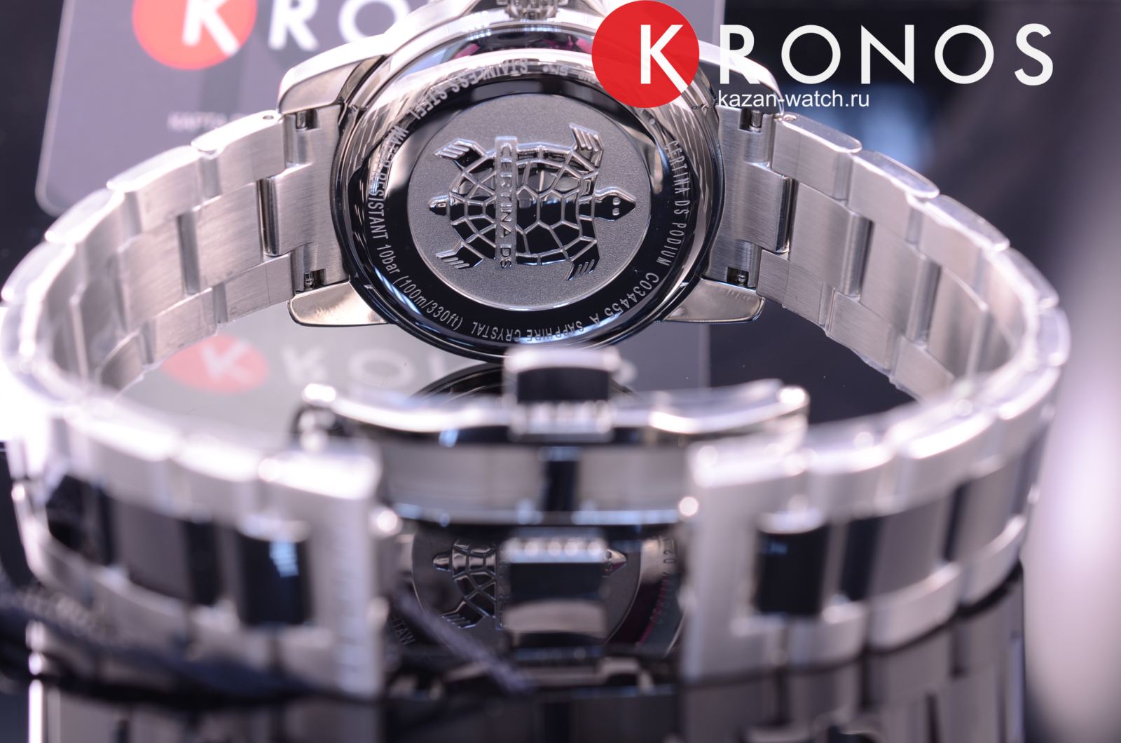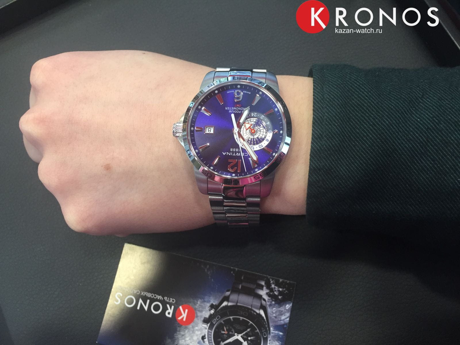 Аксессуар имеет ярко-синий циферблат, дополненный крупной индикацией времени. Оригинально смотрится функциональный счётчик, обеспечивающий индикацию часовых поясов. Корпус и браслет изготовлены из нержавеющей стали 316L, материал высоко ценится за долговечность и устойчивость к царапинам. Швейцарский кварцевый механизм ETA Precidrive™Precidrive™Инновационный кварцевый механизм Certina. Часы, оснащённые этим швейцарским калибром, приравниваются к точности к сертифицированным хронометрам, точность хода составляет +/-10 секунд в год., в 8-10 раз более точен, чем обычные кварцевые часы, это официально подтверждено сертификатом хронометра COSCСертификат COSCОфициальный сертификат, подтверждающий то, что часы ходят с особо высокой точностью. Для получения документа часы подвергаются тестовым испытаниям, разработанным швейцарским институтом тестирования хронометров COSC. Допустимая норма для механических часов -4/+6 секунд в день, для кварцевых моделей +/- 0,07 секунд в день.. Одностороннее антибликовое покрытие сапфирового стекла. Заводная головка с защитой. Люминесцентная подсветкаЛюминесцентное покрытиеПозволяет считывать показания времени в темноте. Производители наносят на стрелки, часовые индексы, безель или поверхность циферблата светонакопительный состав, дающий холодное свечение.. Водонепроницаемость 100 метров. . Календарь, функция GMTGMTОтображение времени второго часового пояса.Такая функция особенно актуальна для путешественников и бизнесменов,которые общаются с людьми из разных стран,теперь вы всегда будете знать,какой час у вашего партнёра или близкого человека., индикатор EOLEOLПредставляет собой систему, уведомляющую владельца часов о необходимости замены элемента питания. За 2 недели до полного разряда батарейки секундная стрелка перестаёт ходить чётко и начинает перепрыгивать на 3-4 деления.. Диаметр корпуса: 43 мм.