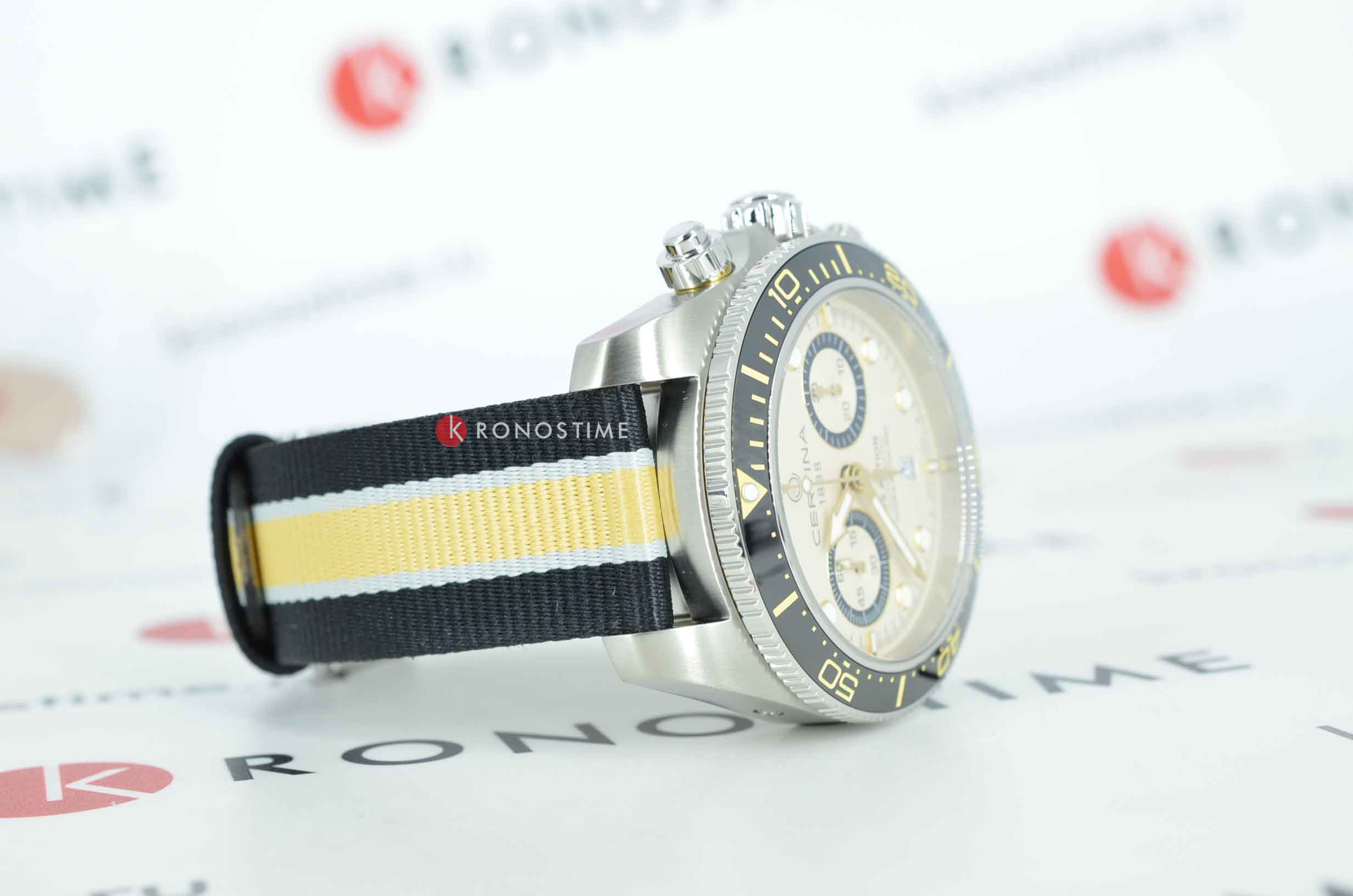 Коллекция DS Action открывает новые «глубины» часового искусства в прямом смысле этого слова: эти «морские» часы в стиле унисекс отличаются точностью, исключительной водостойкостью и динамичным дизайном – идеальный выбор для любой ситуации. Швейцарские мужские механические часы Certina DS Action Diver Chrono C032.827.18.271.00 из коллекции DS Action – безупречно точный и впечатляюще надёжный аксессуар. Габаритный хронографХронографФункция позволяет измерять отрезки времени с особой точностью: часы, минуты, секунды. Верным признаком хронографа является наличие на циферблате 3 дополнительных окошек-счётчиков. с бежевым циферблатом выгодно подчеркнёт повседневный или деловой образ. Модель соответствует стандарту ISO 6425 для дайверских часов и может похвастаться повышенной водостойкостью до 30 бар. Заводная головка, кнопки и задняя крышка завинчиваются для дополнительной герметичности. Аксессуар позволит вам чувствовать себя на высоте и в воде, и на суше. Сапфировое стеклоСапфировое стеклоПрочный и надёжный материал из кристалла сапфира синтетического происхождения, характеризующийся особой твёрдостью и устойчивостью к царапинам и повреждениям. с двухсторонней антибликовой обработкой. Керамический вращающийся безельБезельВнешний ободок, закрепляющий стекло. В спортивных часах так называется поворотное кольцо с делениями на циферблате, выполняет роль таймера – замеряет отрезки времени на шкале. Неподвижный безель – элемент декора. Однонаправленно вращающийся безель на дайверских часах позволяет фиксировать моменты погружения и выныривания на поверхность.. Корпус из нержавеющей стали 316L. Люминесцентная подсветкаЛюминесцентное покрытиеПозволяет считывать показания времени в темноте. Производители наносят на стрелки, часовые индексы, безель или поверхность циферблата светонакопительный состав, дающий холодное свечение.. Календарь, секундомер. Тканевый ремешок. Диаметр корпуса: 44,6 мм. Производство и сборка: Швейцария.