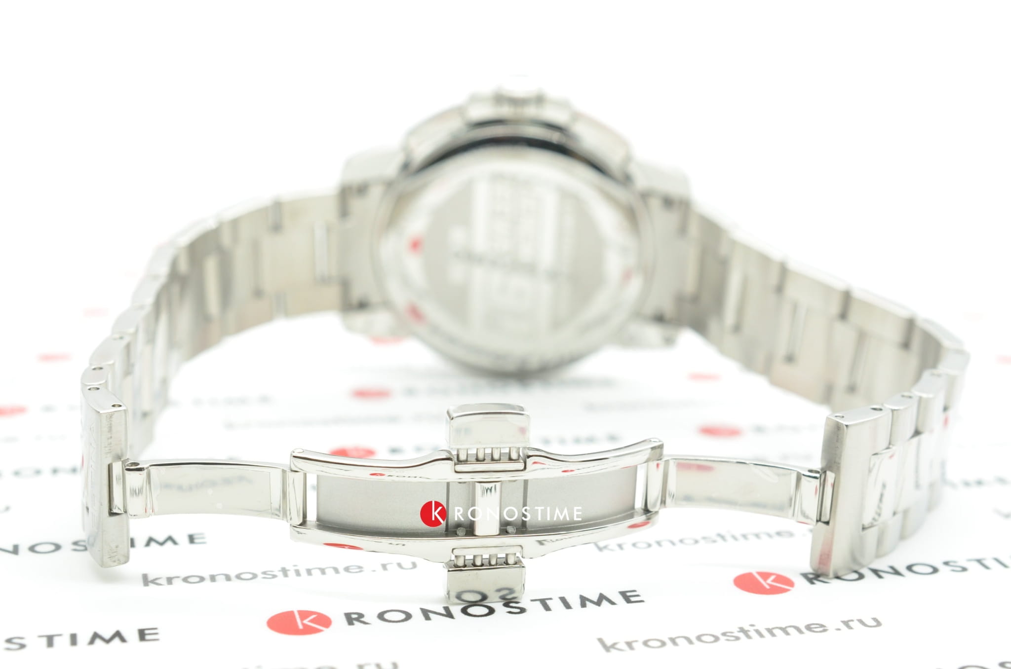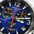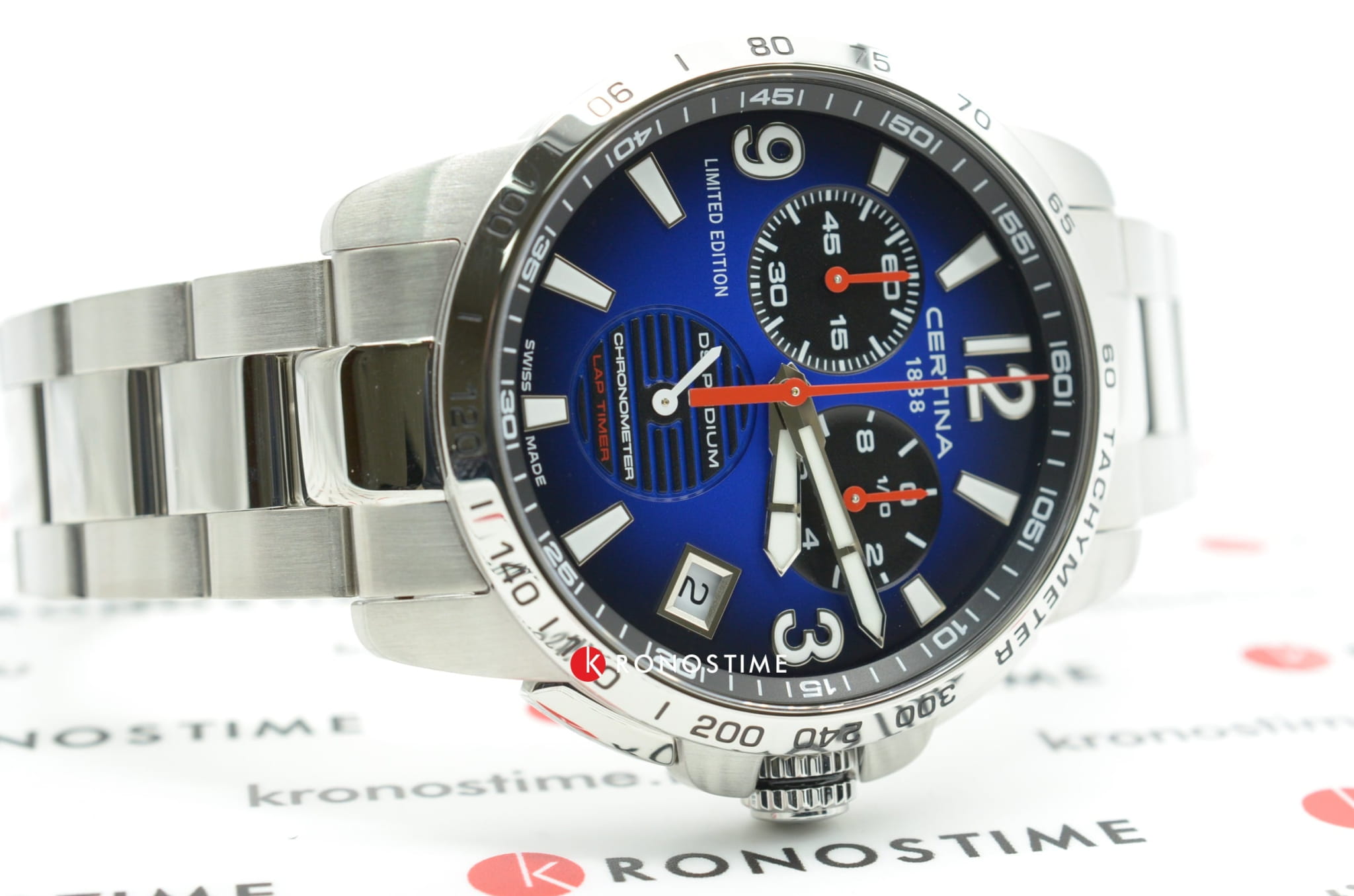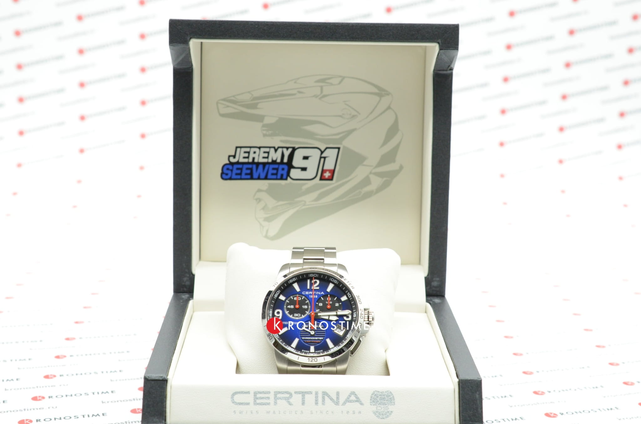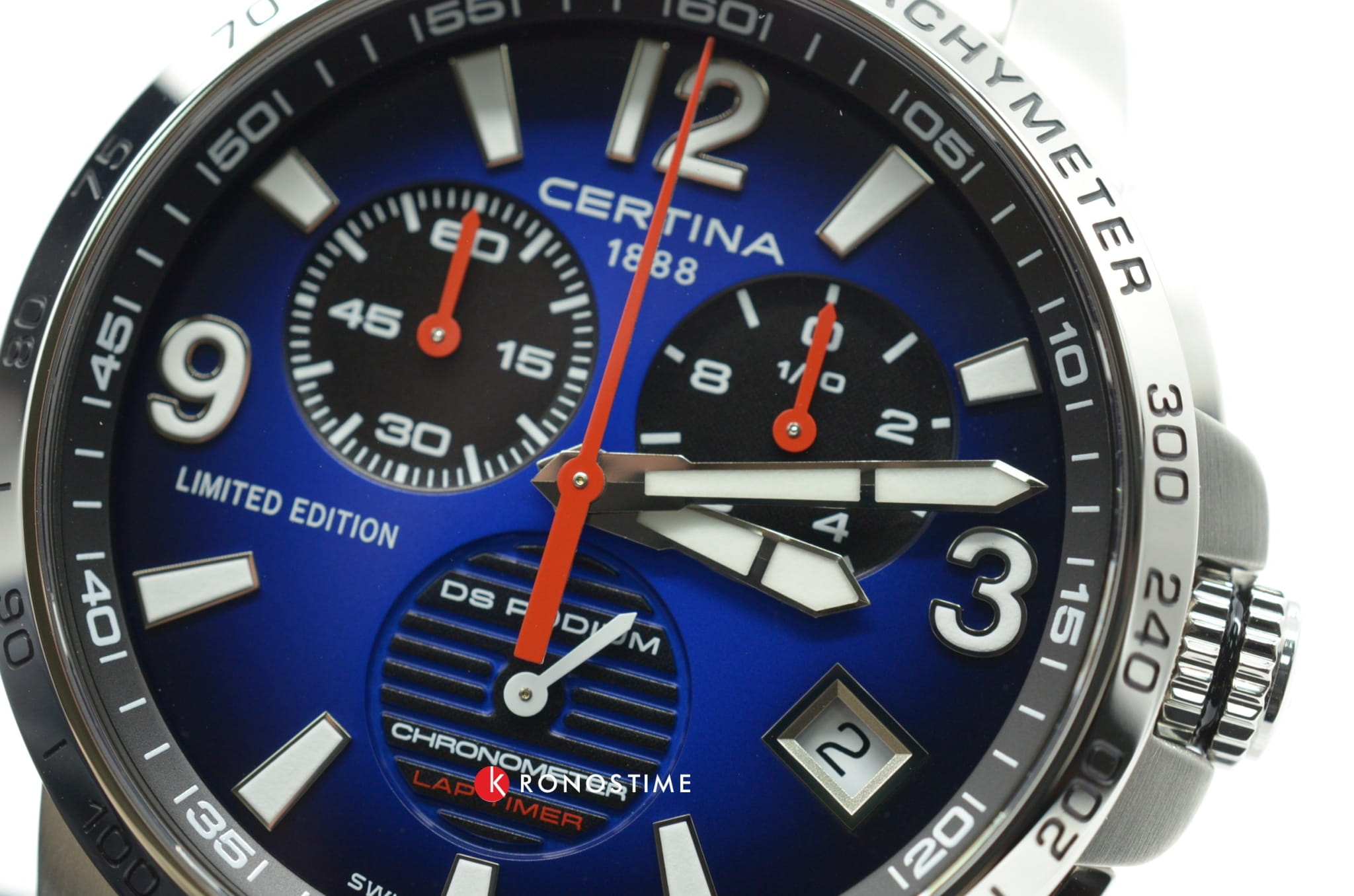 Наручные часы в спортивном стиле привлекают внимание синими деталями, что символизирует скоростное напряжение на гоночной трассе. Отличным дополнением стал браслет из нержавеющей стали. Кварцевый швейцарский механизм ETA G10.212 Precidrive™Precidrive™Инновационный кварцевый механизм Certina. Часы, оснащённые этим швейцарским калибром, приравниваются к точности к сертифицированным хронометрам, точность хода составляет +/-10 секунд в год. с повышенной точностью хода, подтверждённой сертификатом COSCСертификат COSCОфициальный сертификат, подтверждающий то, что часы ходят с особо высокой точностью. Для получения документа часы подвергаются тестовым испытаниям, разработанным швейцарским институтом тестирования хронометров COSC. Допустимая норма для механических часов -4/+6 секунд в день, для кварцевых моделей +/- 0,07 секунд в день.. Система DS ConceptDS ConceptDouble Security Concept, обозначает двойную надёжность и безупречную точность часов Certina. Двойная система защиты подразумевает обеспечение максимальной устойчивости к ударам и высоких показателей водонепроницаемости.. Двухстороннее антибликовое покрытие для стекла из сапфира. Стрелки и индексы с составом SuperLumiNovaЛюминесцентное покрытиеПозволяет считывать показания времени в темноте. Производители наносят на стрелки, часовые индексы, безель или поверхность циферблата светонакопительный состав, дающий холодное свечение.. Заводная головка с защитой. ХронографХронографФункция позволяет измерять отрезки времени с особой точностью: часы, минуты, секунды. Верным признаком хронографа является наличие на циферблате 3 дополнительных окошек-счётчиков., шкала тахиметраТахиметрРазмеченная шкала, располагается на ободке или безеле часов. Тахиметр позволяет рассчитать скорость на определённом участке пути, расстояние измеряется в километрах или милях., календарь, секундомер, индикатор EOLEOLПредставляет собой систему, уведомляющую владельца часов о необходимости замены элемента питания. За 2 недели до полного разряда батарейки секундная стрелка перестаёт ходить чётко и начинает перепрыгивать на 3-4 деления., Lap-функция измерения промежуточного времени (круга). Диаметр корпуса: 42 мм.