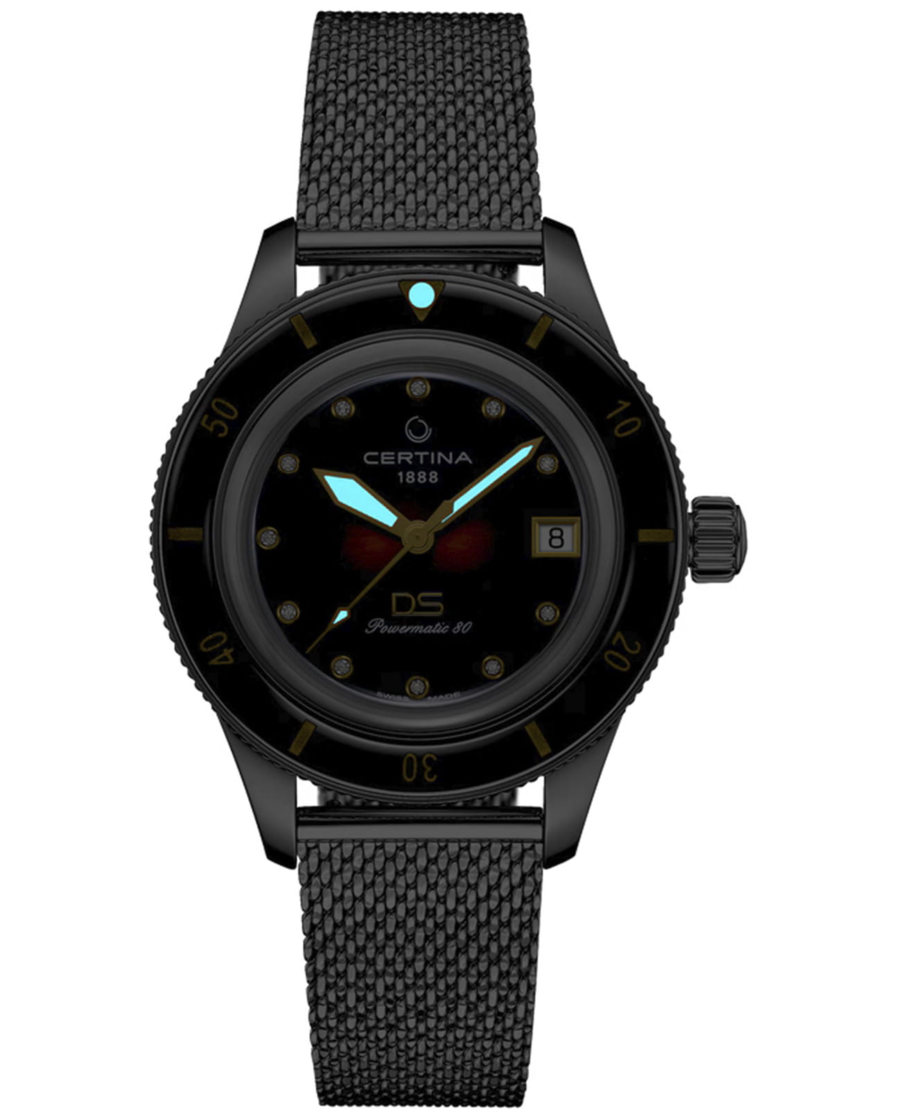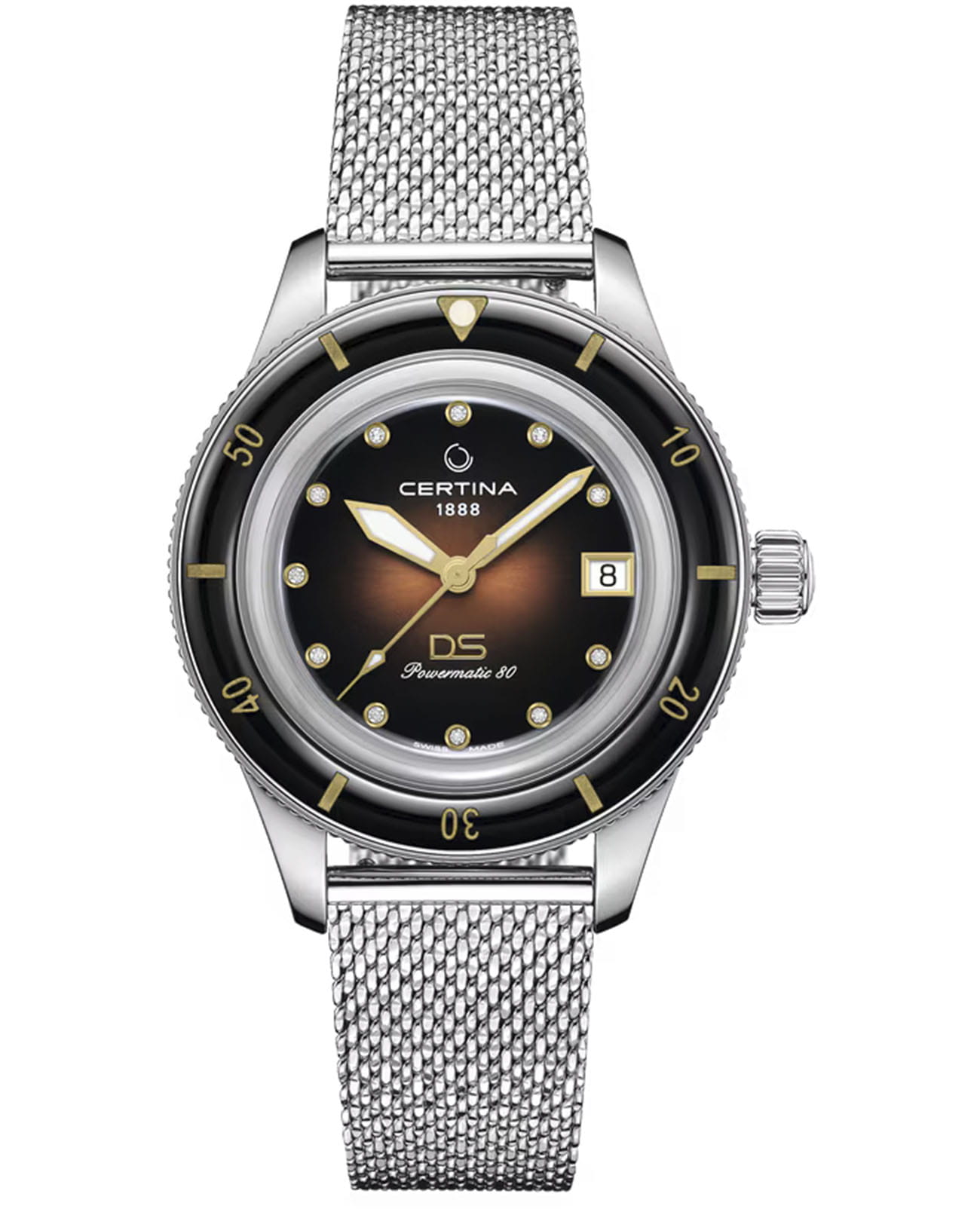 Женские механические часы с автоподзаводом Certina из коллекции DS PH200M — это сочетание надежности, элегантности и дайверского стиля. Корпус диаметром 39 мм и толщиной 11,9 мм выполнен из нержавеющей стали 316L с элементами керамики. Циферблат коричневого цвета оформлен индексами в виде меток и украшен 11 бриллиантами, придающими изделию роскошный вид. Окошко даты расположено в положении 3 часов. Циферблат защищён сапфировым стекломСапфировое стеклоПрочный и надёжный материал из кристалла сапфира синтетического происхождения, характеризующийся особой твёрдостью и устойчивостью к царапинам и повреждениям. с антибликовым покрытиемАнтибликовое покрытиеСлой оксида металла в 0,13-0,3 микрон, благодаря которому стекло часов не бликует и не отражает свет. Антибликовое покрытие уменьшает отражение света в 10 раз, обеспечивая отличную читаемость показателей циферблата., устойчивым к царапинам. Механизм — автоматический калибр Powermatic 80 с антимагнитной пружиной Nivachron™Nivachron™Специально разработанный инновационный сплав Nivachron™ повышает устойчивость часов к воздействию магнитных полей. и запасом хода 80 часов. Прозрачная задняя крышка открывает вид на механизм. Часы оснащены стальным браслетом миланского плетения на застёжке «бабочка» с кнопкамиЗастёжка "бабочка"Такой вид застёжки дополняется предохранителями, помогающими избежать случайного раскрытия браслета. Обладают изящным исполнением. . Завинчивающаяся коронка обеспечивает дополнительную защиту. Водонепроницаемость 200 м позволяет использовать часы для плавания и дайвинга. Гарантия — 24 месяца. Идеальный выбор для тех, кто ценит швейцарское качество, стиль и функциональность.