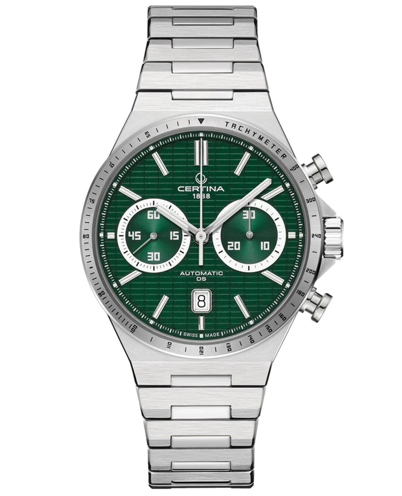 Мужские часы-хронографХронографФункция позволяет измерять отрезки времени с особой точностью: часы, минуты, секунды. Верным признаком хронографа является наличие на циферблате 3 дополнительных окошек-счётчиков. Certina DS-7 Chrono Auto C043.427.11.091.00. Корпус часов изготовлен из нержавеющей стали 316L. Под твердым сапфировым стекломСапфировое стеклоПрочный и надёжный материал из кристалла сапфира синтетического происхождения, характеризующийся особой твёрдостью и устойчивостью к царапинам и повреждениям. с антибликовым покрытиемАнтибликовое покрытиеСлой оксида металла в 0,13-0,3 микрон, благодаря которому стекло часов не бликует и не отражает свет. Антибликовое покрытие уменьшает отражение света в 10 раз, обеспечивая отличную читаемость показателей циферблата. Окошко даты в положении 6 часа, а также маркировку, покрытую люминесцентным покрытиемЛюминесцентное покрытиеПозволяет считывать показания времени в темноте. Производители наносят на стрелки, часовые индексы, безель или поверхность циферблата светонакопительный состав, дающий холодное свечение. Super-LumiNova. Класс водозащиты: 100 метров, позволит плавать, нырять и заниматься другими водными видами спорта. Стальной браслет на застёжке-бабочке с кнопкамиЗастёжка "бабочка"Такой вид застёжки дополняется предохранителями, помогающими избежать случайного раскрытия браслета. Обладают изящным исполнением. .ТахиметрТахиметрРазмеченная шкала, располагается на ободке или безеле часов. Тахиметр позволяет рассчитать скорость на определённом участке пути, расстояние измеряется в километрах или милях..