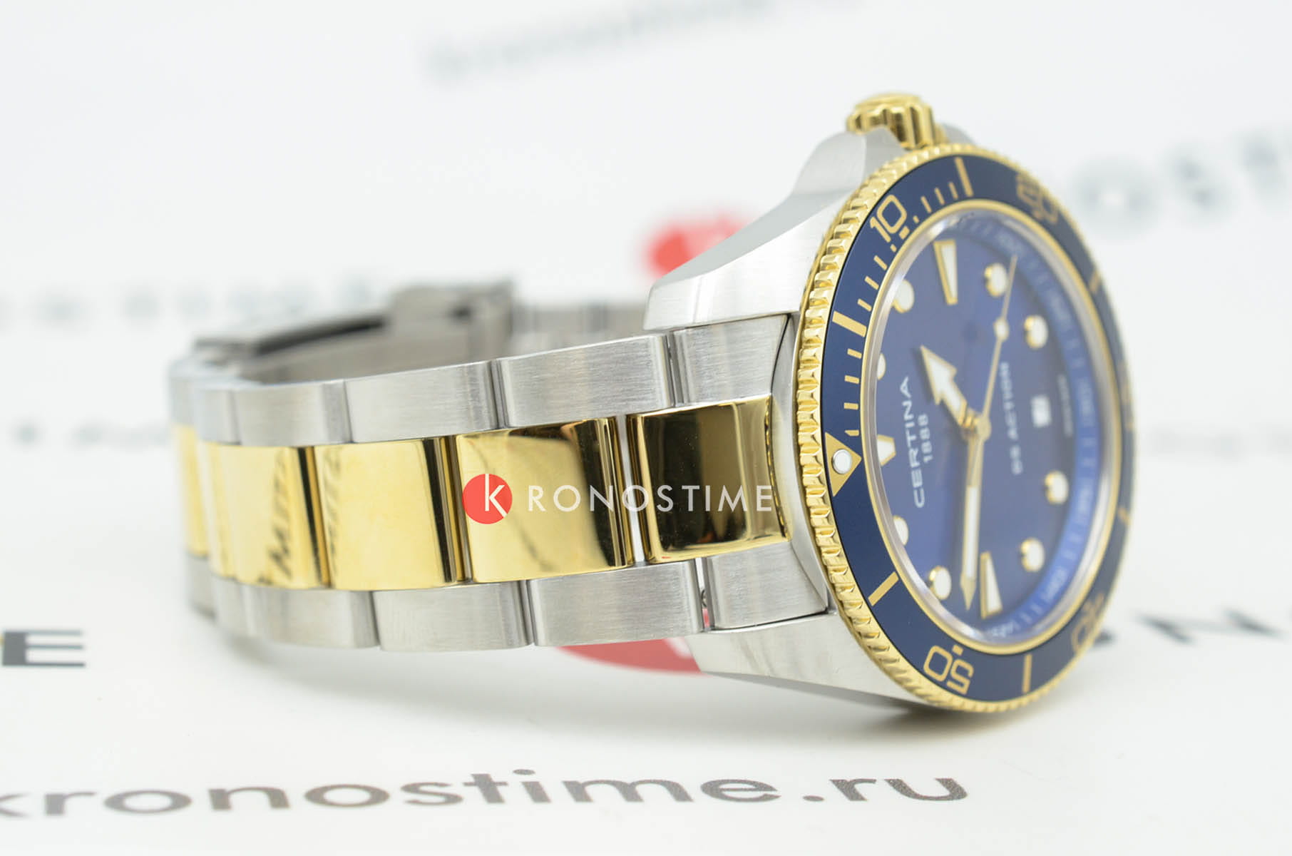 Certina DS Action C048.410.22.041.00 – элегантные мужские часы, сочетающие современный стиль и надёжную функциональность. Корпус диаметром 40 мм выполнен из нержавеющей стали 316L с частичным PVD-покрытиемPVDУльтратонкое покрытие наносится в технике вакуумного напыления, сочетает в себе нитрид титана особой прочности со слоем золота или оксида хрома. Несёт в себе декоративную или защитную функцию., придающим модели утончённый вид. Синий циферблат с метками и стрелками, покрытыми люминесцентным покрытиемЛюминесцентное покрытиеПозволяет считывать показания времени в темноте. Производители наносят на стрелки, часовые индексы, безель или поверхность циферблата светонакопительный состав, дающий холодное свечение., обеспечивает отличную читаемость в любых условиях, а его поверхность защищена сапфировым стекломСапфировое стеклоПрочный и надёжный материал из кристалла сапфира синтетического происхождения, характеризующийся особой твёрдостью и устойчивостью к царапинам и повреждениям. с антибликовым покрытиемАнтибликовое покрытиеСлой оксида металла в 0,13-0,3 микрон, благодаря которому стекло часов не бликует и не отражает свет. Антибликовое покрытие уменьшает отражение света в 10 раз, обеспечивая отличную читаемость показателей циферблата., устойчивым к царапинам. Часы оснащены швейцарским кварцевым механизмом ETA F06.412 с технологией Precidrive™Precidrive™Инновационный кварцевый механизм Certina. Часы, оснащённые этим швейцарским калибром, приравниваются к точности к сертифицированным хронометрам, точность хода составляет +/-10 секунд в год., обеспечивающей исключительную точность хода. Функция EOLEOLПредставляет собой систему, уведомляющую владельца часов о необходимости замены элемента питания. За 2 недели до полного разряда батарейки секундная стрелка перестаёт ходить чётко и начинает перепрыгивать на 3-4 деления. (индикатор окончания заряда батареи) предупреждает о необходимости замены элемента питания. Браслет из нержавеющей стали 316L с частичным PVD-покрытием оснащён системой быстрой замены, позволяющей легко адаптировать стиль часов. Водонепроницаемость 300 метров (30 бар) делает модель идеальным выбором для плавания и дайвинга.