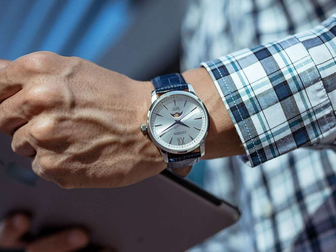 Часы Citizen AK5000-03A произведены в Японии и оснащены надёжным кварцевым механизмом калибра Citizen 6324. Корпус выполнен из нержавеющей стали и имеет классическую круглую форму диаметром 42 мм. Минеральное стеклоМинеральное стеклоМинеральное стекло представляет собой искусственно выращенный минерал кварца. Такое стекло отличается особой устойчивостью к повреждениям и царапинам. Уступает по некоторым качествам сапфировому стеклу. защищает серебристый циферблат, украшенный эффектом солнечных лучей по технологии Sunray. На циферблате расположены клиновидные стрелки в стиле Dauphine, метки в виде штрихов и римская цифра в положении 12 часов, а также индикатор фазы Луны — одно из самых востребованных усложнений в часовой классике. Часы защищены от воды по стандарту 50WR, что позволяет не бояться случайных брызг и дождя. Заводная головка отличается рифлёной поверхностью для удобства использования. Модель комплектуется синим кожаным ремешком с тиснением под кожу аллигатора и классической застёжкой. В качестве элемента питания используется батарейка SR621SW, обеспечивающая автономную работу до двух лет.