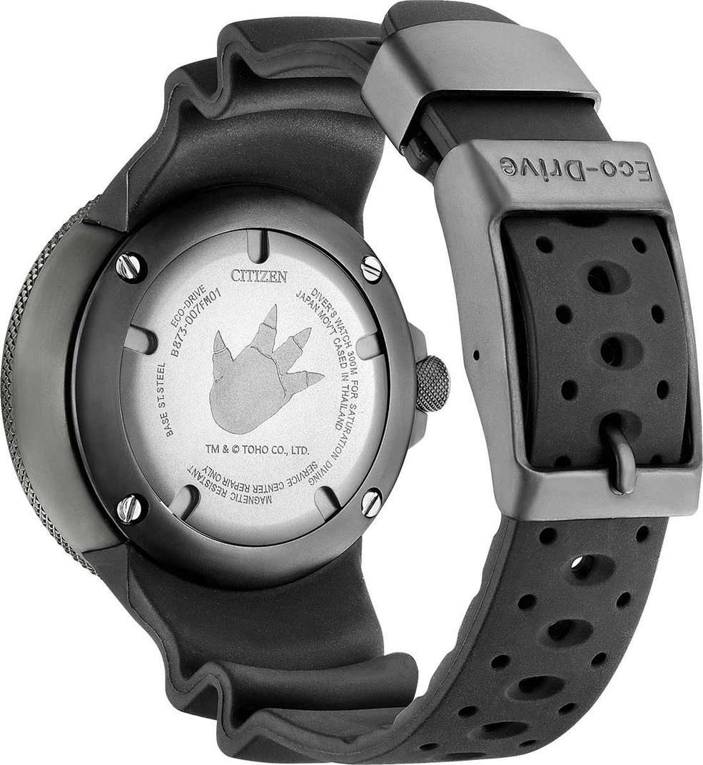 Мужские часы Citizen Promaster BJ8059-03Z спортивного дизайна с высоким уровнем водозащиты. Лимитированная серия - 2500 экземпляров. Корпус из нержавеющей стали с IP-покрытиемIP-покрытиеМетод ионного напыления. Демонстрирует повышенную устойчивость к истиранию, окислению и химическим веществам. Под воздействием высокого давления и температуры около 1500°C молекулы металла надёжно соединяются с частицами корпуса часов. диаметром 48,2 мм идеально сбалансирован. Минеральное стеклоМинеральное стеклоМинеральное стекло представляет собой искусственно выращенный минерал кварца. Такое стекло отличается особой устойчивостью к повреждениям и царапинам. Уступает по некоторым качествам сапфировому стеклу. обеспечивает отличную защиту циферблата от царапин. Часы работают на основе кварцевого механизма, питание от солнечной энергии, запас энергии на 180 дней. Каучуковый ремешок на стандартной застёжке идеально дополняют дизайн часов, обеспечивая комфортное ношение. Стрелки и метки на циферблате имеют люминесцентное покрытиеЛюминесцентное покрытиеПозволяет считывать показания времени в темноте. Производители наносят на стрелки, часовые индексы, безель или поверхность циферблата светонакопительный состав, дающий холодное свечение. позволяющее легко определять время даже в темноте. БезельБезельВнешний ободок, закрепляющий стекло. В спортивных часах так называется поворотное кольцо с делениями на циферблате, выполняет роль таймера – замеряет отрезки времени на шкале. Неподвижный безель – элемент декора. Однонаправленно вращающийся безель на дайверских часах позволяет фиксировать моменты погружения и выныривания на поверхность. вращается в одном направлении. Функция индикации заряда (EOL) и предотвращения перезарядки. Окошко даты находится в положении 3 часа. Часы обладают впечатляющей водонепроницаемостью до 300WR, что делает их идеальными для плавания, ныряния и погружений с аквалангом. Модель вдохновлена персонажем из комиксов, мультфильмов и кинофильмов монстром Годзилла, которому в 2024 году исполняется 70 лет.