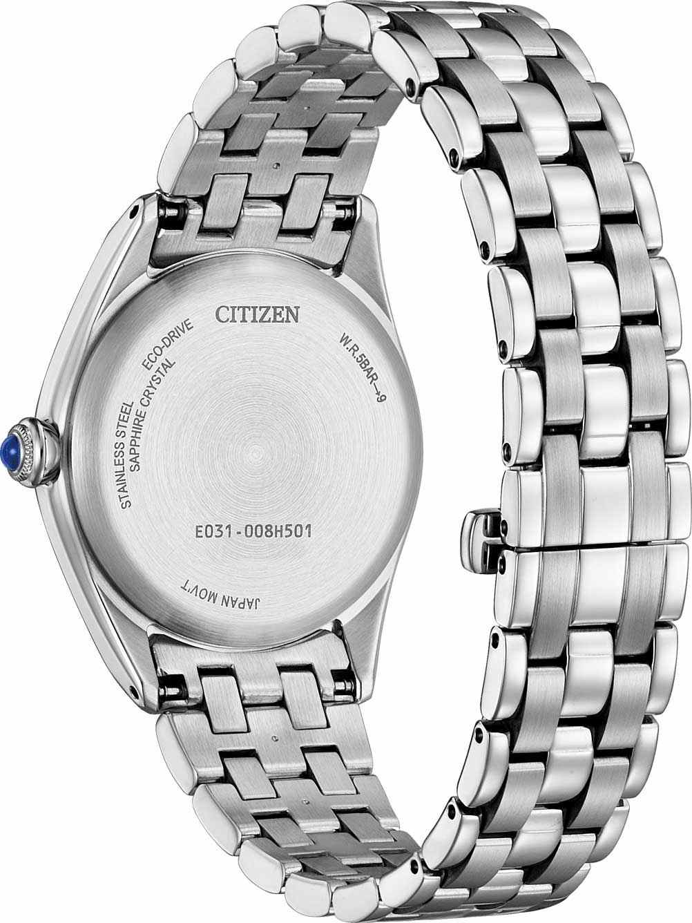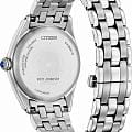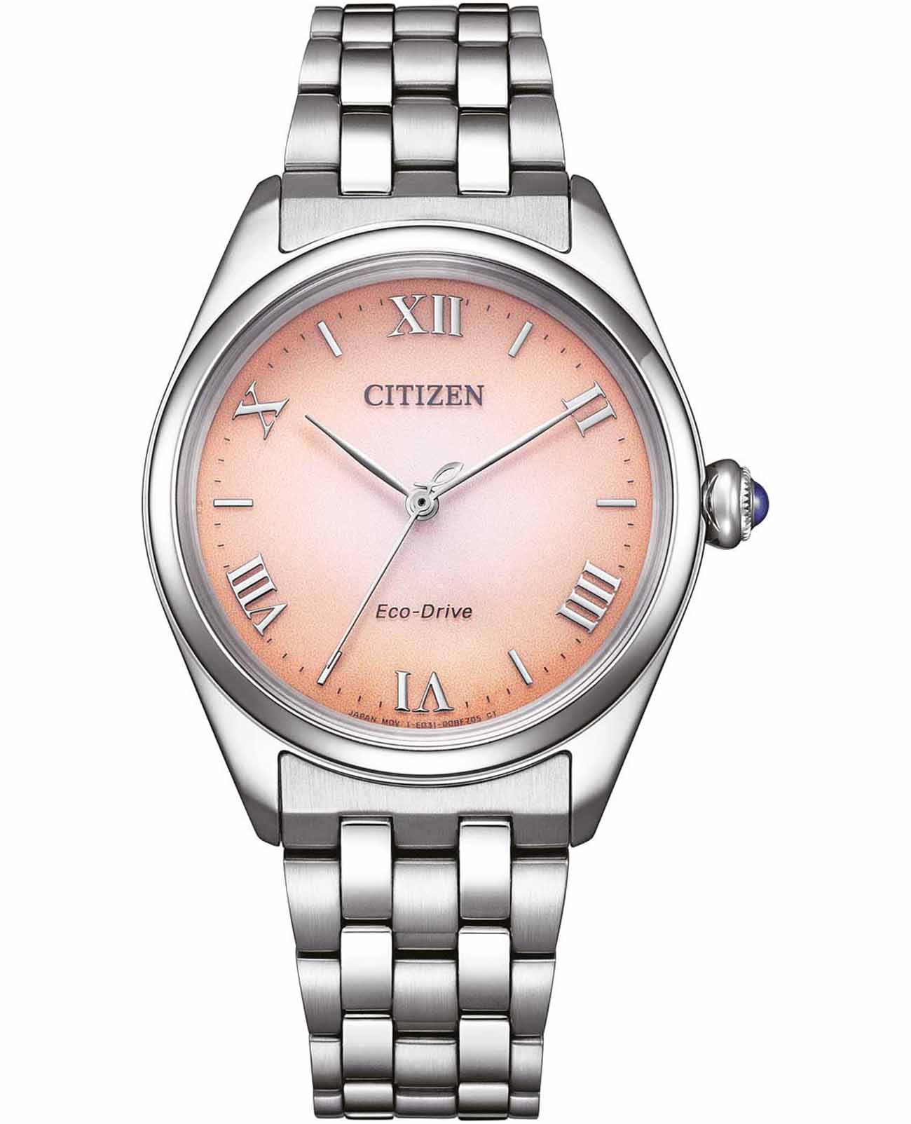 Часы Citizen EM1140-80X созданы для тех, кто ценит изящество и передовые технологии. Модель выполнена в Японии и оснащена кварцевым механизмом Citizen E031 с инновационной системой Eco-Drive, которая обеспечивает питание от солнечной энергии и не требует замены батарейки. Запаса энергии хватает на 180 дней, а функция индикации заряда и система предотвращения перезарядки гарантируют стабильную работу. Корпус диаметром 33 мм и толщиной 8,7 мм изготовлен из высококачественной стали, а персиковый циферблат с римскими цифрами и штрихами придает часам утончённый вид. Сапфировое стеклоСапфировое стеклоПрочный и надёжный материал из кристалла сапфира синтетического происхождения, характеризующийся особой твёрдостью и устойчивостью к царапинам и повреждениям. надежно защищает циферблат от царапин и повреждений. Заводная головка украшена камнем в форме кабошона, что добавляет особого шарма аксессуару. Стальной браслет с удобной застежкой «бабочка»Застёжка "бабочка"Такой вид застёжки дополняется предохранителями, помогающими избежать случайного раскрытия браслета. Обладают изящным исполнением. обеспечивает комфортную посадку на запястье. Водозащита уровня 50WR позволяет использовать часы в повседневной жизни, не опасаясь попадания влаги. Эта модель станет стильным и надежным дополнением к вашему образу.
