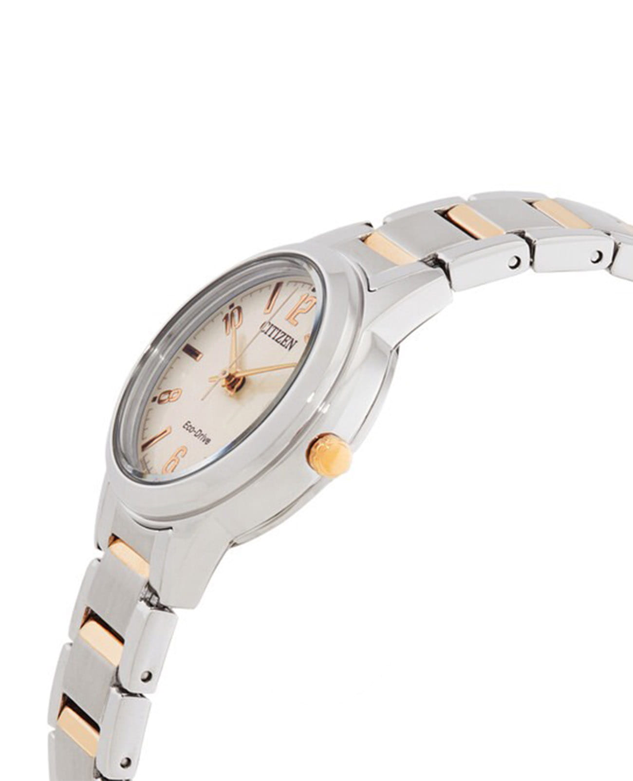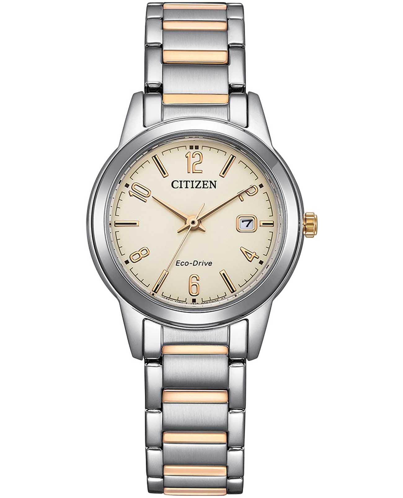 Citizen FE1244-72A— изящные японские часы, сочетающие современные технологии и классический стиль. Модель оснащена надежным кварцевым механизмом Citizen J710 с инновационной системой Eco-Drive, обеспечивающей питание от солнечной энергии без необходимости замены батарейки. Корпус и браслет выполнены из высококачественной нержавеющей стали, а на браслет (частично) нанесено IP-покрытиеIP-покрытиеМетод ионного напыления. Демонстрирует повышенную устойчивость к истиранию, окислению и химическим веществам. Под воздействием высокого давления и температуры около 1500°C молекулы металла надёжно соединяются с частицами корпуса часов., что гарантирует долговечность и комфорт при ежедневном ношении. Браслет оснащен надежной раскладной застёжкойРаскладная застёжкаТакой тип застёжки используется только на браслетах из металла. Она никогда не раскрывается полностью, происходит разделение на 2 и более частей. Раскладывающая застёжка снизит вероятность потери часов к минимуму. с системой блокировки, что обеспечивает дополнительную безопасность при ношении. Защиту от мелких повреждений обеспечивает прочное минеральное стеклоМинеральное стеклоМинеральное стекло представляет собой искусственно выращенный минерал кварца. Такое стекло отличается особой устойчивостью к повреждениям и царапинам. Уступает по некоторым качествам сапфировому стеклу.. Нежно-желтый циферблат, выполненный по технологии Sunray (солнечные лучи), украшен аккуратными часовыми метками и арабскими цифрами, предусмотрена функция индикации даты. Функция индикации заряда EOLEOLПредставляет собой систему, уведомляющую владельца часов о необходимости замены элемента питания. За 2 недели до полного разряда батарейки секундная стрелка перестаёт ходить чётко и начинает перепрыгивать на 3-4 деления. своевременно подскажет о необходимости подзарядки. Водостойкость WR 30 позволяет не беспокоиться о случайных брызгах воды. Диаметр корпуса составляет 29,4 мм, что делает модель особенно элегантной и удобной.