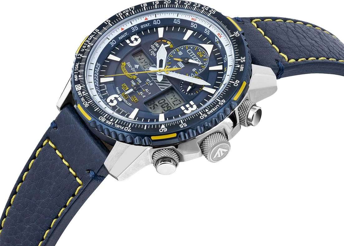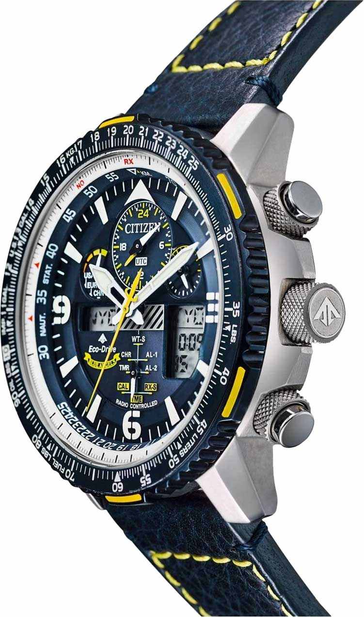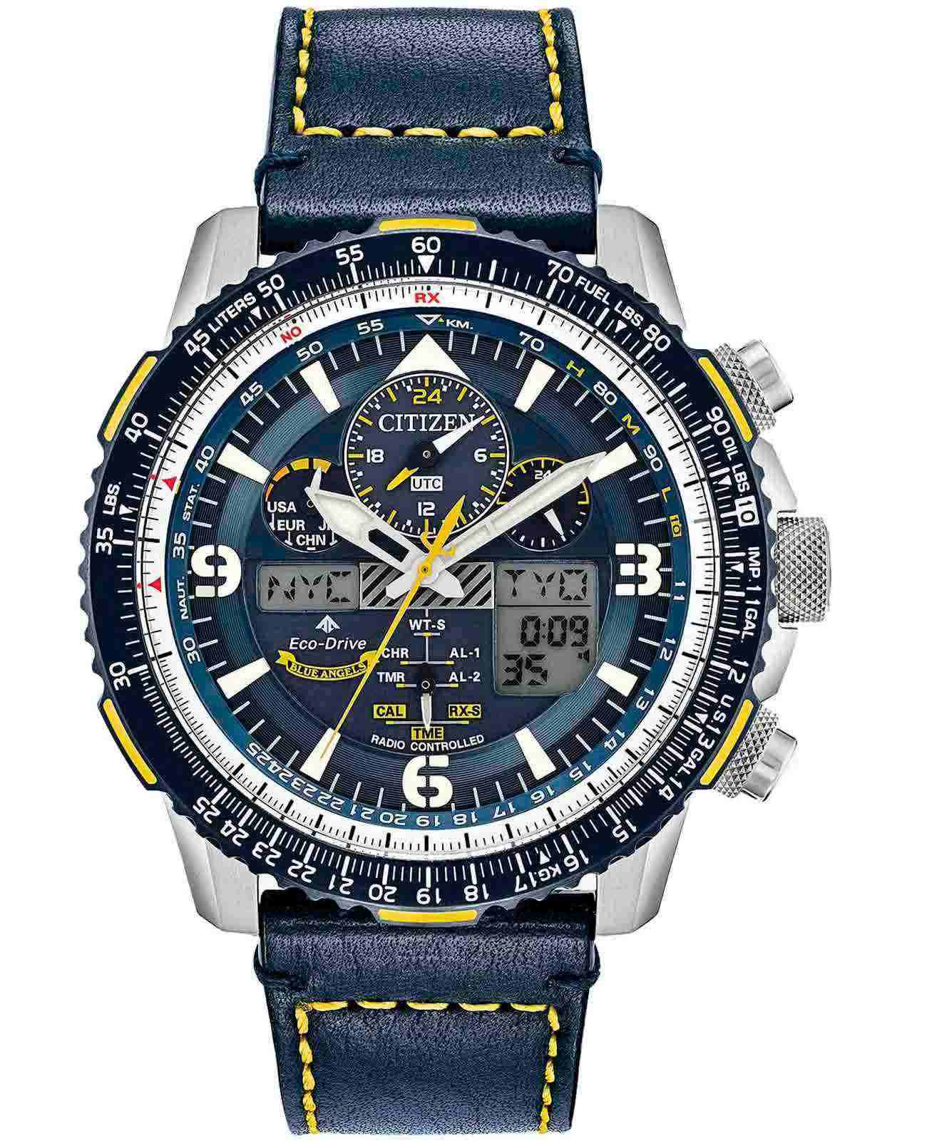 Citizen Promaster JY8078-01L часы-хронографХронографФункция позволяет измерять отрезки времени с особой точностью: часы, минуты, секунды. Верным признаком хронографа является наличие на циферблате 3 дополнительных окошек-счётчиков. с секундомеромСекундомерСекундоме́р — прибор, способный измерять интервалы времени с точностью до долей секунды. спортивного дизайна с высоким уровнем водозащиты. Корпус из нержавеющей стали диаметром 45,4 мм идеально сбалансирован. Сапфировое стеклоСапфировое стеклоПрочный и надёжный материал из кристалла сапфира синтетического происхождения, характеризующийся особой твёрдостью и устойчивостью к царапинам и повреждениям. обеспечивает отличную защиту циферблата от царапин. Часы работают на основе кварцевого механизма, питание от солнечной энергии. Кожаный ремешок на стандартной застёжке идеально дополняют дизайн часов, обеспечивая комфортное ношение. Стрелки и метки на циферблате имеют люминесцентное покрытиеЛюминесцентное покрытиеПозволяет считывать показания времени в темноте. Производители наносят на стрелки, часовые индексы, безель или поверхность циферблата светонакопительный состав, дающий холодное свечение. позволяющее легко определять время даже в темноте. Поворотный безельБезельВнешний ободок, закрепляющий стекло. В спортивных часах так называется поворотное кольцо с делениями на циферблате, выполняет роль таймера – замеряет отрезки времени на шкале. Неподвижный безель – элемент декора. Однонаправленно вращающийся безель на дайверских часах позволяет фиксировать моменты погружения и выныривания на поверхность. с IP-покрытиемIP-покрытиеМетод ионного напыления. Демонстрирует повышенную устойчивость к истиранию, окислению и химическим веществам. Под воздействием высокого давления и температуры около 1500°C молекулы металла надёжно соединяются с частицами корпуса часов.. Автоматический прием сигналов от радиовышек, расположенных в различных точках земного шара, которые передают временные сигналы от определенных атомных часов. Коррекция текущего времени радиосигналом на территории почти всей Европы, США, Японии и Китая. Функция индикации заряда (EOL) и предотвращения перезарядки. Мировое времяМировое время Полезное часовое усложнение, отображающее время в основных городах и известных областях по всему миру, оно связано с часовыми поясами, удобно для путешественников и бизнесменов. - 43 города (29 часовых поясов), переход на зимнее и летнее время. Всемирное координированное время UTCUTCВсемирное кординационное время, не имеющее привязки к географическому положению Гринвича, основывается на атомном отсчёте времени. Регулировка времени осуществляется более точно, чем устаревшее GMT.