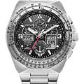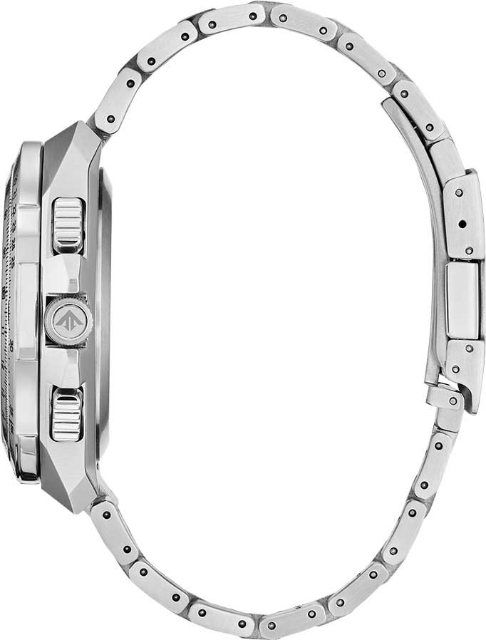 Citizen Promaster JY8120-58E часы-хронографХронографФункция позволяет измерять отрезки времени с особой точностью: часы, минуты, секунды. Верным признаком хронографа является наличие на циферблате 3 дополнительных окошек-счётчиков. с секундомеромСекундомерСекундоме́р — прибор, способный измерять интервалы времени с точностью до долей секунды. спортивного дизайна с высоким уровнем водозащиты. Корпус из нержавеющей стали диаметром 45,7 мм идеально сбалансирован. Сапфировое стеклоСапфировое стеклоПрочный и надёжный материал из кристалла сапфира синтетического происхождения, характеризующийся особой твёрдостью и устойчивостью к царапинам и повреждениям. с антибликовым покрытием обеспечивает отличную защиту циферблата от царапин. Часы работают на основе кварцевого механизма, питание от солнечной энергии. Стальной браслет на раскладной застёжкеРаскладная застёжкаТакой тип застёжки используется только на браслетах из металла. Она никогда не раскрывается полностью, происходит разделение на 2 и более частей. Раскладывающая застёжка снизит вероятность потери часов к минимуму. идеально дополняют дизайн часов, обеспечивая комфортное ношение. Стрелки и метки на циферблате имеют люминесцентное покрытиеЛюминесцентное покрытиеПозволяет считывать показания времени в темноте. Производители наносят на стрелки, часовые индексы, безель или поверхность циферблата светонакопительный состав, дающий холодное свечение. позволяющее легко определять время даже в темноте. Поворотный безельБезельВнешний ободок, закрепляющий стекло. В спортивных часах так называется поворотное кольцо с делениями на циферблате, выполняет роль таймера – замеряет отрезки времени на шкале. Неподвижный безель – элемент декора. Однонаправленно вращающийся безель на дайверских часах позволяет фиксировать моменты погружения и выныривания на поверхность.. Автоматический прием сигналов от радиовышек, расположенных в различных точках земного шара, которые передают временные сигналы от определенных атомных часов. Коррекция текущего времени радиосигналом на территории почти всей Европы, США, Японии и Китая. Функция индикации заряда (EOL) и предотвращения перезарядки. Мировое времяМировое время Полезное часовое усложнение, отображающее время в основных городах и известных областях по всему миру, оно связано с часовыми поясами, удобно для путешественников и бизнесменов. - 43 города, переход на зимнее и летнее время. Всемирное координированное время UTCUTCВсемирное кординационное время, не имеющее привязки к географическому положению Гринвича, основывается на атомном отсчёте времени. Регулировка времени осуществляется более точно, чем устаревшее GMT.