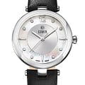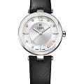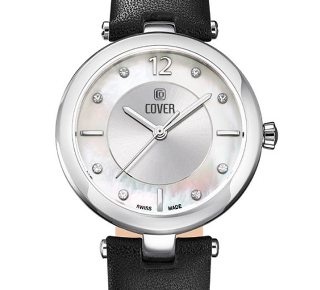 Женственные коктейльные часы COVER CO193.06 из коллекции Amelia работают на кварцевом калибре ETA. Циферблат имеет центральную область серебристого цвета с узором Sunray и белую перламутровую периферийную часть, которые защищены минеральным стекломМинеральное стеклоМинеральное стекло представляет собой искусственно выращенный минерал кварца. Такое стекло отличается особой устойчивостью к повреждениям и царапинам. Уступает по некоторым качествам сапфировому стеклу. с сапфировым напылением. В качестве часовых меток используются 8 кристаллов Swarovski, а также 3 накладных индекса и арабская цифра «12». Корпус из стали диаметром 32 мм с широким полированным безелемБезельВнешний ободок, закрепляющий стекло. В спортивных часах так называется поворотное кольцо с делениями на циферблате, выполняет роль таймера – замеряет отрезки времени на шкале. Неподвижный безель – элемент декора. Однонаправленно вращающийся безель на дайверских часах позволяет фиксировать моменты погружения и выныривания на поверхность.. Часы комплектуются черным кожаным ремешком на стандартной застёжке и имеют маркировку «Swiss Made».