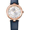 Женственные коктейльные часы COVER CO193.11 из коллекции Amelia работают на кварцевом калибре ETA. Циферблат имеет центральную область серебристого цвета с узором Sunray и белую перламутровую периферийную часть, которые защищены минеральным стекломМинеральное стеклоМинеральное стекло представляет собой искусственно выращенный минерал кварца. Такое стекло отличается особой устойчивостью к повреждениям и царапинам. Уступает по некоторым качествам сапфировому стеклу. с сапфировым напылением. В качестве часовых меток используются 8 кристаллов Swarovski, а также 3 накладных индекса и арабская цифра «12». Корпус 32 мм диаметром выполнен из нержавеющей стали с PVD-покрытиемPVDУльтратонкое покрытие наносится в технике вакуумного напыления, сочетает в себе нитрид титана особой прочности со слоем золота или оксида хрома. Несёт в себе декоративную или защитную функцию. цвета розового золота, с широким полированным безелемБезельВнешний ободок, закрепляющий стекло. В спортивных часах так называется поворотное кольцо с делениями на циферблате, выполняет роль таймера – замеряет отрезки времени на шкале. Неподвижный безель – элемент декора. Однонаправленно вращающийся безель на дайверских часах позволяет фиксировать моменты погружения и выныривания на поверхность.. Часы комплектуются темно-синим кожаным ремешком на стандартной застёжке и имеют маркировку «Swiss Made».