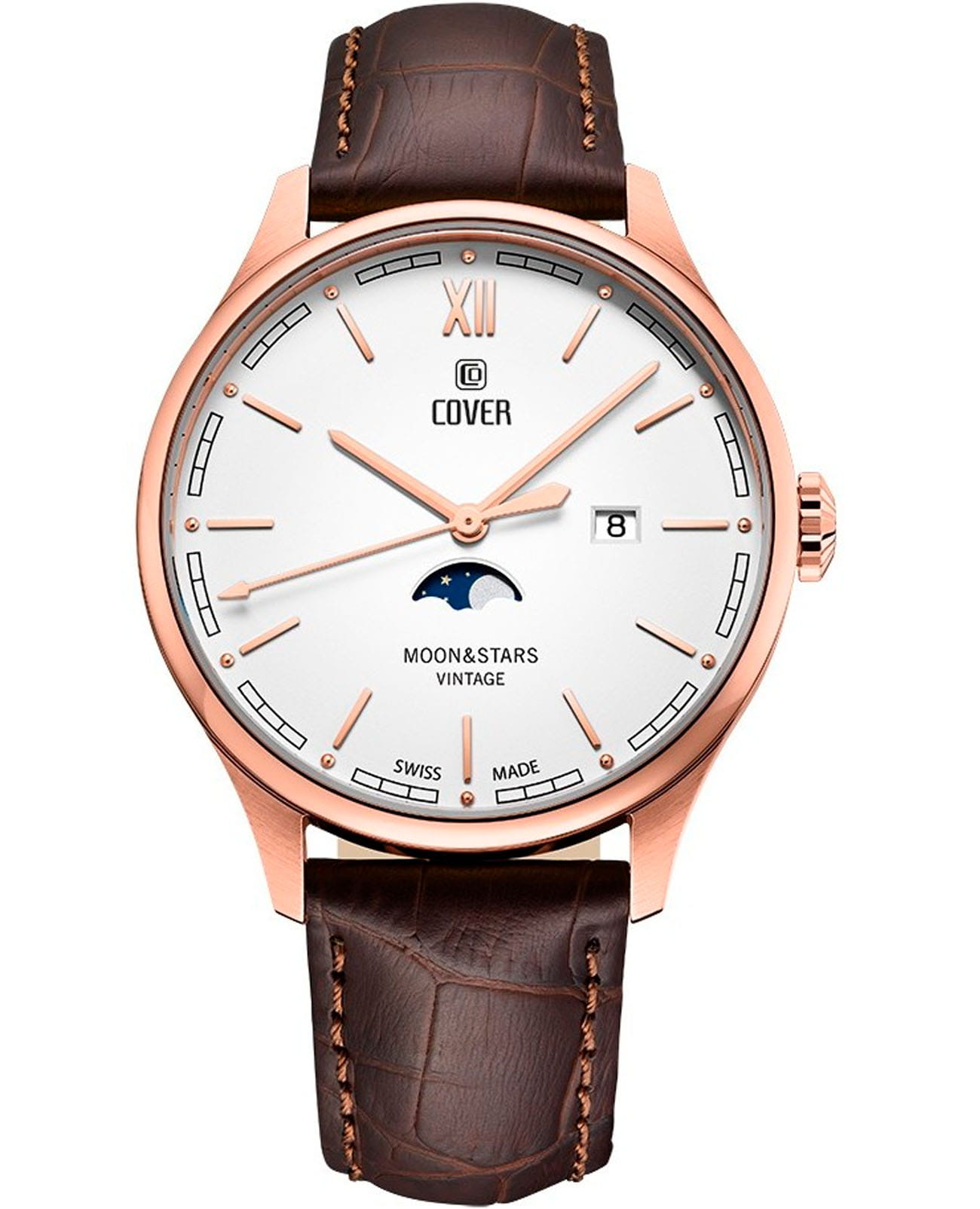 Мужские наручные часы Cover CO202.06 из коллекции Chapman Moon&Stars Gent сочетают в себе классический дизайн и надежность современных технологий. Модель обладает круглым корпусом диаметром 41 мм, изготовленным из нержавеющей стали с PVD-покрытиемPVDУльтратонкое покрытие наносится в технике вакуумного напыления, сочетает в себе нитрид титана особой прочности со слоем золота или оксида хрома. Несёт в себе декоративную или защитную функцию., что обеспечивает высокую устойчивость к внешним воздействиям. Браслет выполнен из натуральной кожи, гарантирующей комфортное ношение. Белый циферблат оснащен окном даты на «3 часах» и индикатором фаз Луны. Для защиты используется минеральное стеклоМинеральное стеклоМинеральное стекло представляет собой искусственно выращенный минерал кварца. Такое стекло отличается особой устойчивостью к повреждениям и царапинам. Уступает по некоторым качествам сапфировому стеклу., обеспечивающее прочную защиту от царапин. Часы работают на кварцевом механизме, что гарантирует точное время без необходимости подзаводки. Модель также обладает водонепроницаемостью до 5 атмосфер (50 метров), что позволяет использовать их во время плавания без ныряния.