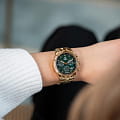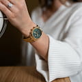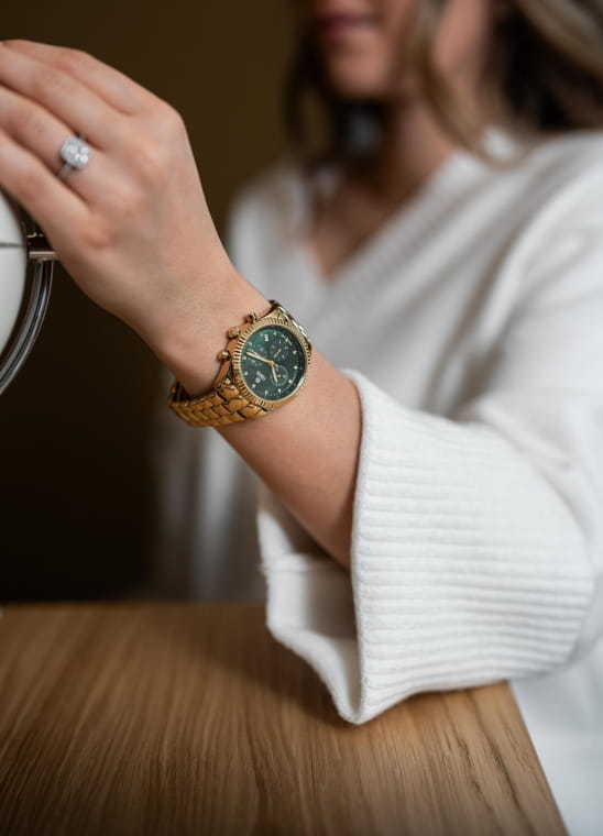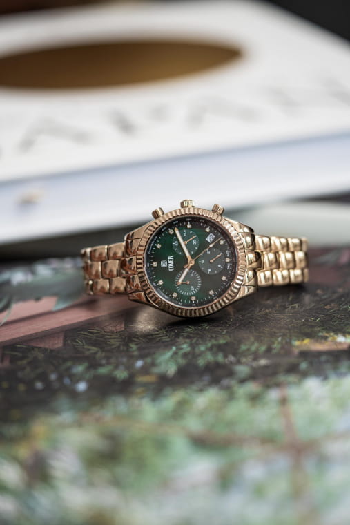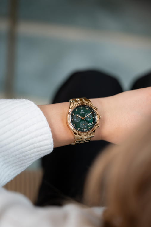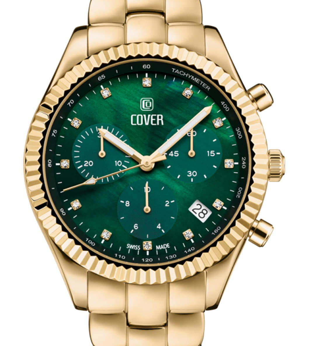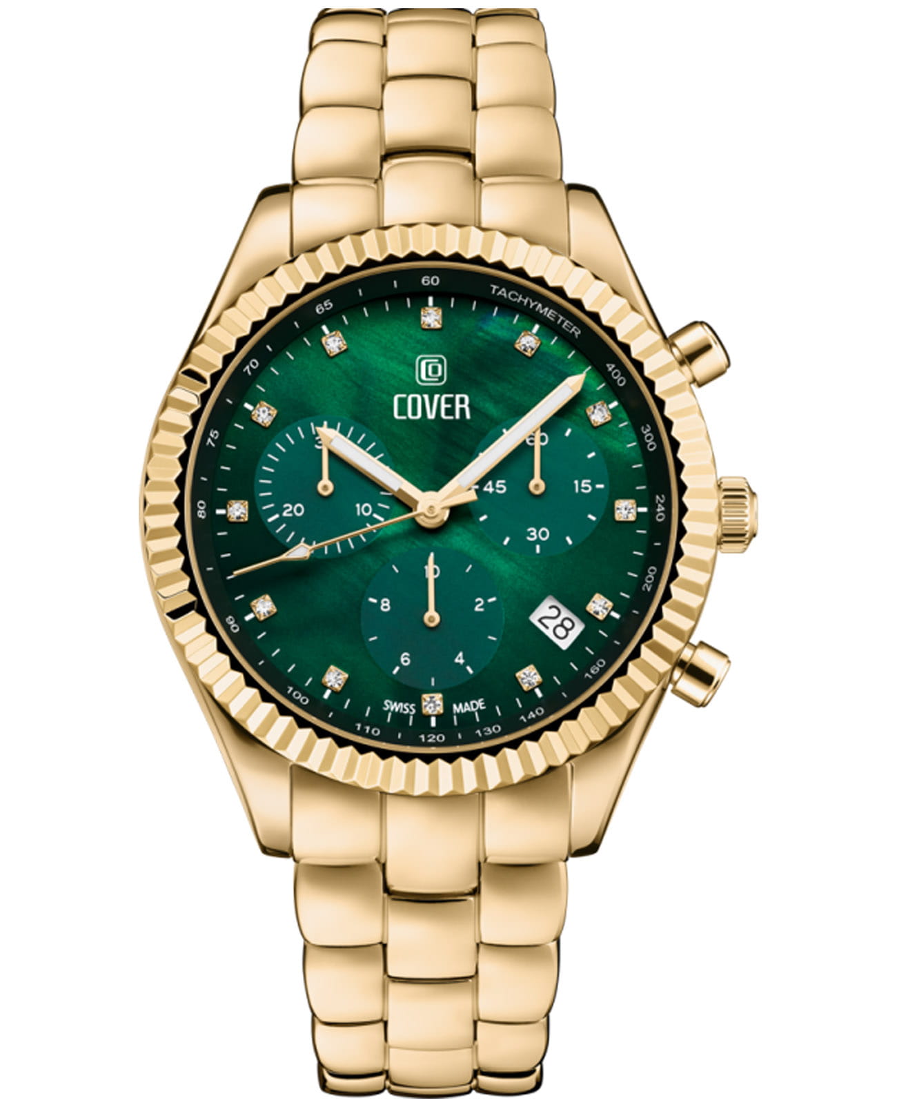 Элегантные женские часы Cover CO207.04 в спортивном стиле из коллекции Valentina Chronograph — это идеальное сочетание утонченности и функциональности. Оснащенные кварцевым механизмом с модулем хронографа Ronda 5040.D, они обеспечивают точность и надежность в каждом моменте. Зеленый перламутровый циферблат с 12 кристаллами Swarovski в роли часовых индексов придает часам изысканный вид, а три накопителя на «3», «6» и «9 часах» вместе с апертурой даты между «4» и «5 часами» добавляют функциональности. ТахиметрТахиметрРазмеченная шкала, располагается на ободке или безеле часов. Тахиметр позволяет рассчитать скорость на определённом участке пути, расстояние измеряется в километрах или милях.ическая шкала на внутреннем фланце позволяет легко отслеживать скорость, что делает эти часы не только стильными, но и практичными. Корпус диаметром 38 мм с рифленым ,безелемБезельВнешний ободок, закрепляющий стекло. В спортивных часах так называется поворотное кольцо с делениями на циферблате, выполняет роль таймера – замеряет отрезки времени на шкале. Неподвижный безель – элемент декора. Однонаправленно вращающийся безель на дайверских часах позволяет фиксировать моменты погружения и выныривания на поверхность. и интегрированный браслет из нержавеющей стали с PVD-покрытиемPVDУльтратонкое покрытие наносится в технике вакуумного напыления, сочетает в себе нитрид титана особой прочности со слоем золота или оксида хрома. Несёт в себе декоративную или защитную функцию. подчеркивают современный дизайн и комфорт при ношении. С водонепроницаемостью до 50 м и сапфировым стекломСапфировое стеклоПрочный и надёжный материал из кристалла сапфира синтетического происхождения, характеризующийся особой твёрдостью и устойчивостью к царапинам и повреждениям., эти часы идеально подходят для активных женщин. Маркировка «Swiss Made» гарантирует высокое качество и долговечность. Гарантия на изделие составляет 2 года, что подтверждает надежность и уверенность в вашем выборе. Эти часы станут не только прекрасным дополнением к вашему образу, но и верным спутником в повседневной жизни.