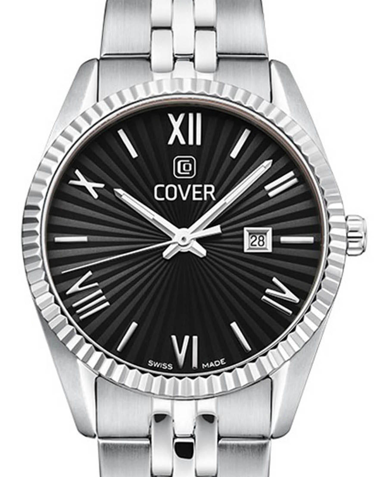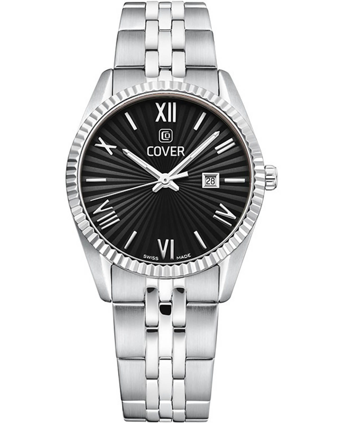Часы COVER CO217.01 из коллекции Alston – элегантная модель швейцарского производства. Эти часы станут идеальным аксессуаром для элегантных дам, которые ценят стиль и качество. Корпус и браслет с раскладной застёжкойРаскладная застёжкаТакой тип застёжки используется только на браслетах из металла. Она никогда не раскрывается полностью, происходит разделение на 2 и более частей. Раскладывающая застёжка снизит вероятность потери часов к минимуму. изготовлены из нержавеющей стали, имеют диаметр 30 мм. На черном циферблате расположены  накладные римские цифры. Надежное минеральное стеклоМинеральное стеклоМинеральное стекло представляет собой искусственно выращенный минерал кварца. Такое стекло отличается особой устойчивостью к повреждениям и царапинам. Уступает по некоторым качествам сапфировому стеклу. защищает часы от царапин и долго сохраняет первоначальный внешний вид. Они показывают день месяца, индикатор которых с накладной рамкой расположен в положении «3 часа». Водозащита 50 метров делает часы практичными для повседневного использования. На часовую, минутную стрелки нанесено люминесцентное покрытиеЛюминесцентное покрытиеПозволяет считывать показания времени в темноте. Производители наносят на стрелки, часовые индексы, безель или поверхность циферблата светонакопительный состав, дающий холодное свечение., которое светится в темноте, создавая необычное изображение. Эти часы идеально подойдут для светских раутов, бизнес-встреч и других важных событий, подчеркнут вашу элегантность и статус.