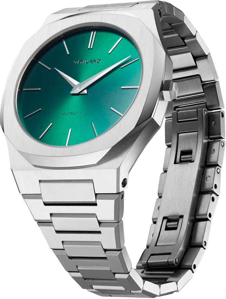 Часы D1 Milano UTBJ37 — это уникальные кварцевые часы, которые подчеркнут ваш изысканный стиль. Эти наручные часы из коллекции Ultra Thin с эффектным монохромным дизайном станут выразительным акцентом вашего образа. Корпус диаметром 40 мм из нержавеющей стали придает часам современный и утонченный вид. Зеленый циферблат метками в виде штрихов, а серебристые хроматические стрелки и индексы создают стильный контраст, подчёркивая элегантность модели. Задняя крышка из нержавеющей стали закреплена на 8-х винтах и дополнена индивидуальным серийным номером, что подчеркивает уникальность каждого экземпляра. Стальной браслет с раскладной застёжкойРаскладная застёжкаТакой тип застёжки используется только на браслетах из металла. Она никогда не раскрывается полностью, происходит разделение на 2 и более частей. Раскладывающая застёжка снизит вероятность потери часов к минимуму. обеспечивает надежность и комфорт в повседневном использовании. Сапфировое стеклоСапфировое стеклоПрочный и надёжный материал из кристалла сапфира синтетического происхождения, характеризующийся особой твёрдостью и устойчивостью к царапинам и повреждениям. с антибликовым покрытием защищает циферблат, а водозащита до 50WR делает эти часы практичным выбором для любых условий. Благодаря калибру Miyota 1L22, они отличаются точностью и надежностью. Эти итальянские часы представляют собой идеальное сочетание традиционного мастерства и инновационного подхода, воплощая в себе новый взгляд на классическую элегантность.