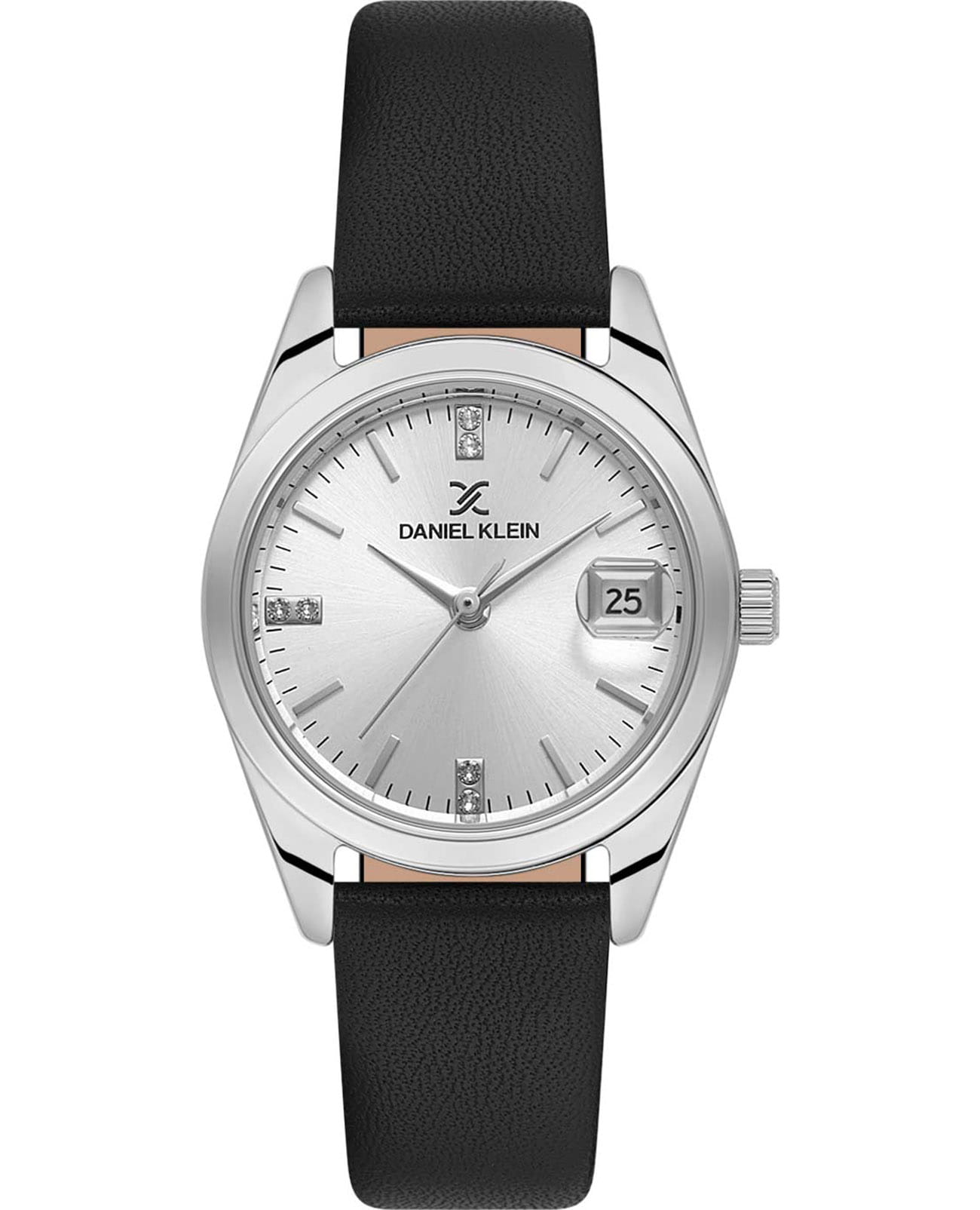 Женские кварцевые часы Daniel Klein — это эффектный аксессуар для современной женщины. Корпус диаметром 28 мм выполнен из нержавеющей стали. Циферблат серебристого цвета выполнен по технологии Sunray («солнечные лучи») и оформлен штрихами с кристаллами и стрелками. Окошко даты расположено в положении 3 часов и оснащено увеличительным стеклом (Cyclops). Циферблат защищён минеральным стекломМинеральное стеклоМинеральное стекло представляет собой искусственно выращенный минерал кварца. Такое стекло отличается особой устойчивостью к повреждениям и царапинам. Уступает по некоторым качествам сапфировому стеклу.. Часы оснащены кожаным ремешком на классической пряжке. Водонепроницаемость 30 м позволяет использовать часы в повседневных условиях. Идеальный выбор для тех, кто ценит турецкое качество и элегантный дизайн.