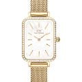 Женские наручные часы с минеральным стекломМинеральное стеклоМинеральное стекло представляет собой искусственно выращенный минерал кварца. Такое стекло отличается особой устойчивостью к повреждениям и царапинам. Уступает по некоторым качествам сапфировому стеклу. Daniel Wellington Quadro Lumine Bezel Evergold MOP DW00100668, кварцевый механизм с высокой точностью. Корпус часов изготовлен из нержавеющей стали с PVD-покрытиемPVDУльтратонкое покрытие наносится в технике вакуумного напыления, сочетает в себе нитрид титана особой прочности со слоем золота или оксида хрома. Несёт в себе декоративную или защитную функцию.. БезельБезельВнешний ободок, закрепляющий стекло. В спортивных часах так называется поворотное кольцо с делениями на циферблате, выполняет роль таймера – замеряет отрезки времени на шкале. Неподвижный безель – элемент декора. Однонаправленно вращающийся безель на дайверских часах позволяет фиксировать моменты погружения и выныривания на поверхность. украшен кристаллами Swarovski. Матовый циферблат украшен фирменным логотипом Daniel Wellington. Накладные метки в виде штрихов. Японский кварцевый механизм. Рифленая заводная головка. Класс водозащиты: 30 метров, позволит защитить корпус от случайных брызг или капель дождя. Стальной браслет миланского плетения с PVD-покрытиемPVDУльтратонкое покрытие наносится в технике вакуумного напыления, сочетает в себе нитрид титана особой прочности со слоем золота или оксида хрома. Несёт в себе декоративную или защитную функцию. на раскладном замкеРаскладной замокДанный вариант застежки используется только на часах с металлическим браслетом. Отличительная особенность такого крепления в том, что длина браслета становится универсальной и вы можете самостоятельно отрегулировать нужный вам размер – застежка просто двигается по браслету часов..